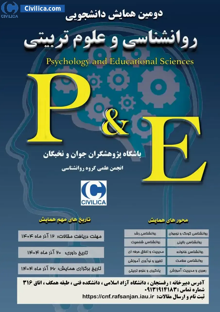 دومین همایش دانشجویی روانشناسی و علوم تربیتی در تاریخ ۲۶ آذر ۱۴۰۴ توسط ،داشگاه آزاد اسلامی واحد رفسنجان در شهر رفسنجان برگزار خواهد شد.با توجه به اینکه این همایش به صورت رسمی برگزار می گردد، کلیه مقالات این کنفرانس در پایگاه سیویلیکا و نیز کنسرسیوم محتوای ملی نمایه خواهد شد و شما می توانید با اطمینان کامل، مقالات خود را در این همایش ارائه نموده و از امتیازات علمی ارائه مقاله کنفرانس با دریافت گواهی کنفرانس استفاده نمایید.