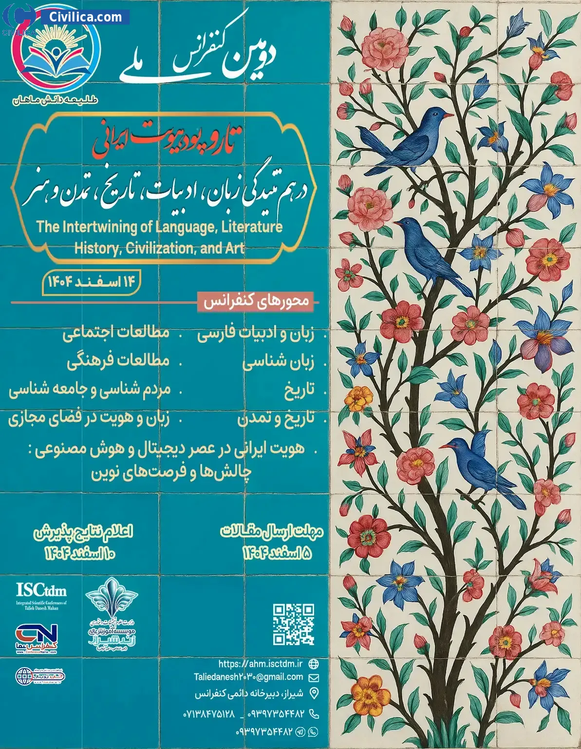 دومین کنفرانس ملی تار و پود هویت ایرانی: در هم تنیدگی زبان، ادبیات، تاریخ، تمدن و هنر در تاریخ ۱۴ اسفند ۱۴۰۴ توسط ،شرکت طلیعه دانش ماهان در شهر شیراز برگزار خواهد شد.با توجه به اینکه این همایش به صورت رسمی برگزار می گردد، کلیه مقالات این کنفرانس در پایگاه سیویلیکا و نیز کنسرسیوم محتوای ملی نمایه خواهد شد و شما می توانید با اطمینان کامل، مقالات خود را در این همایش ارائه نموده و از امتیازات علمی ارائه مقاله کنفرانس با دریافت گواهی کنفرانس استفاده نمایید.