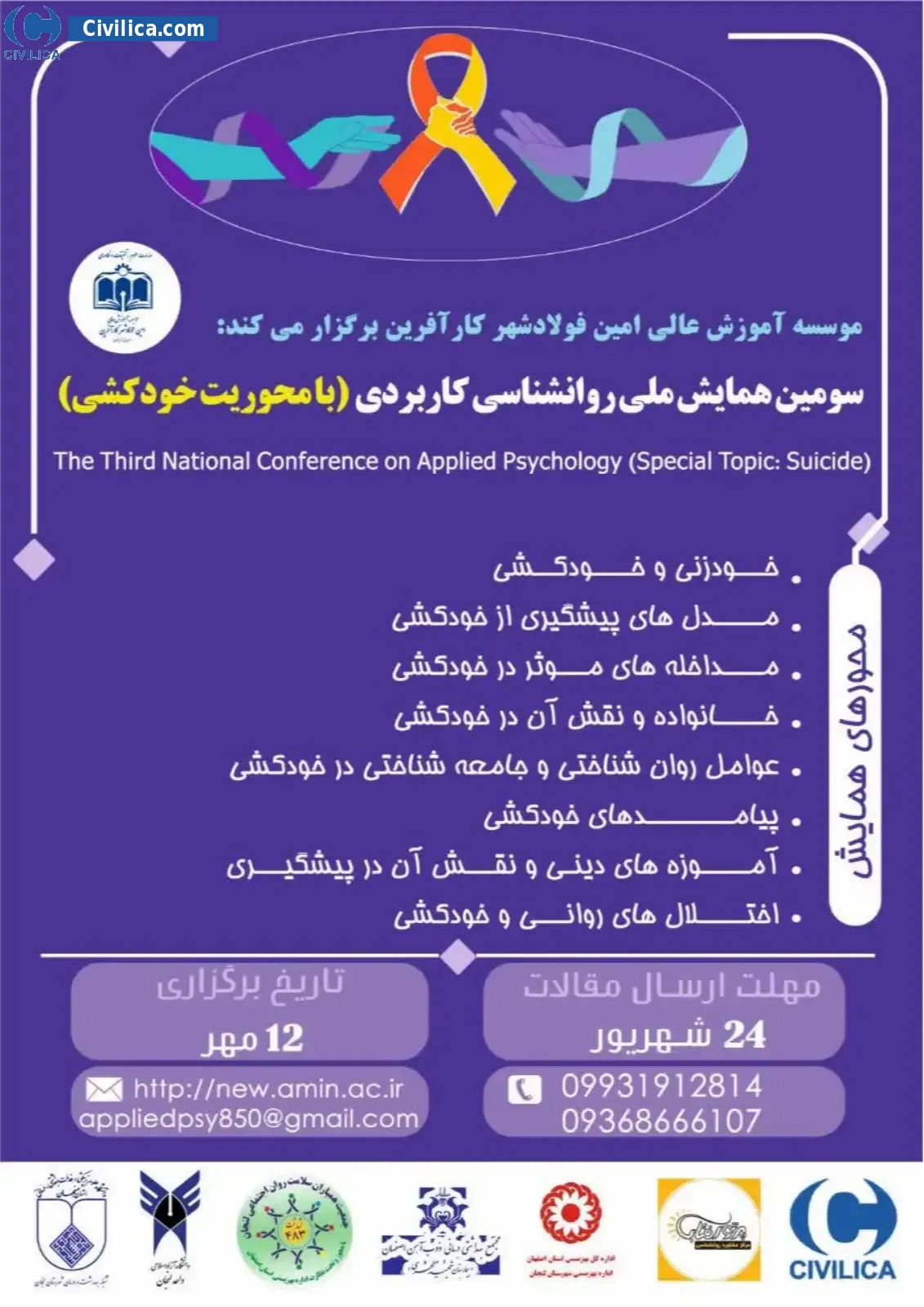 سومین همایش ملی روانشناسی کاربردی (با محوریت خودکشی) در تاریخ ۱۲ مهر ۱۴۰۴ توسط موسسه آموزش عالی امین (فولادشهر)، در شهر لنجان برگزار خواهد شد.با توجه به اینکه این همایش به صورت رسمی برگزار می گردد، کلیه مقالات این کنفرانس در پایگاه سیویلیکا و نیز کنسرسیوم محتوای ملی نمایه خواهد شد و شما می توانید با اطمینان کامل، مقالات خود را در این همایش ارائه نموده و از امتیازات علمی ارائه مقاله کنفرانس با دریافت گواهی کنفرانس استفاده نمایید.
