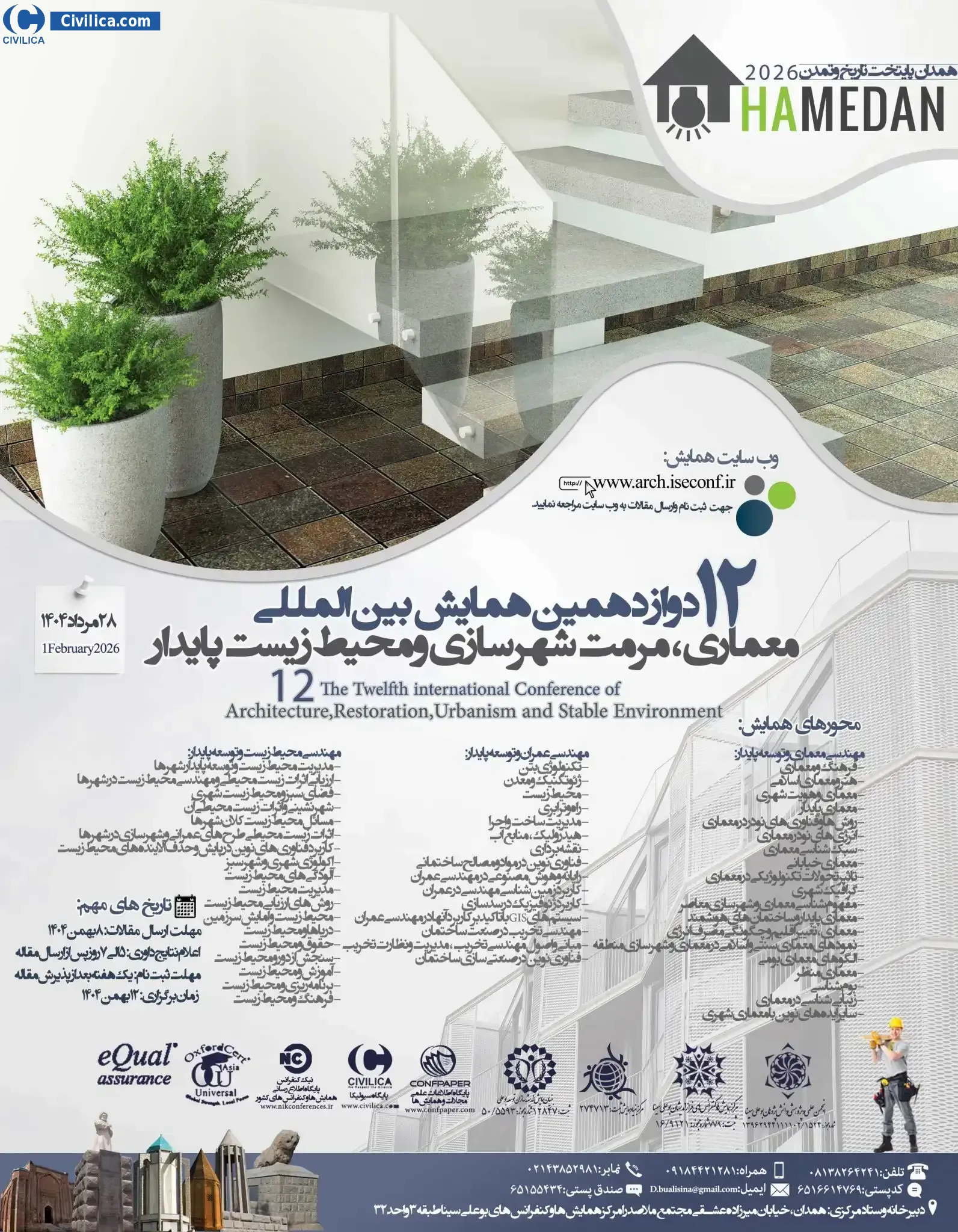 دوازدهمین همایش بین المللی معماری، مرمت شهرسازی و محیط زیست پایدار در تاریخ ۱۲ بهمن ۱۴۰۴ توسط ،مرکز همایش و کنفرانس بوعلی سینا در شهر همدان برگزار خواهد شد.با توجه به اینکه این همایش به صورت رسمی برگزار می گردد، کلیه مقالات این کنفرانس در پایگاه سیویلیکا و نیز کنسرسیوم محتوای ملی نمایه خواهد شد و شما می توانید با اطمینان کامل، مقالات خود را در این همایش ارائه نموده و از امتیازات علمی ارائه مقاله کنفرانس با دریافت گواهی کنفرانس استفاده نمایید.