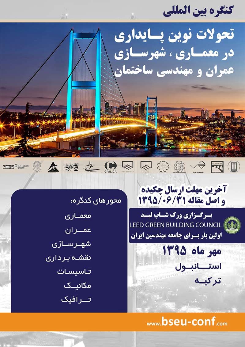 کنگره بین المللی تحولات نوین پایداری در معماری ، شهرسازی ، عمران و مهندسی ساختمان در تاریخ ۲۷ مهر ۱۳۹۵ توسط ،مركز صنعت و ساخت و ساز YEM -كنسرسيوم آنابافت شهر- دانشگاه استانبول تكنيك تركيه ITU-موسسه فرهنگي هنري سلوي نصر برگزار گردید. شما می توانید برای دریافت کلیه مقالات پذیرفته شده در این کنفرانس به صفحه مجموعه مقالات کنگره بین المللی تحولات نوین پایداری در معماری ، شهرسازی ، عمران و مهندسی ساختمان مراجعه فرمایید.
