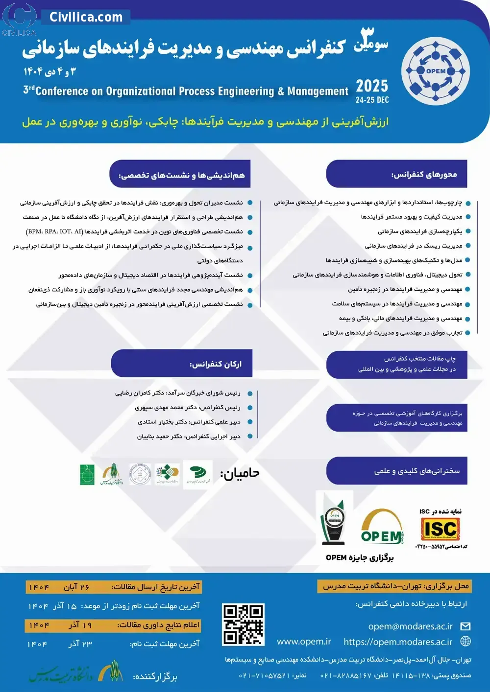 سومین کنفرانس مهندسی و مدیریت فرایندهای سازمانی در تاریخ ۳ دی ۱۴۰۴ توسط دانشگاه تربیت مدرس، در شهر تهران برگزار خواهد شد.با توجه به اینکه این همایش به صورت رسمی برگزار می گردد، کلیه مقالات این کنفرانس در پایگاه سیویلیکا و نیز کنسرسیوم محتوای ملی نمایه خواهد شد و شما می توانید با اطمینان کامل، مقالات خود را در این همایش ارائه نموده و از امتیازات علمی ارائه مقاله کنفرانس با دریافت گواهی کنفرانس استفاده نمایید.