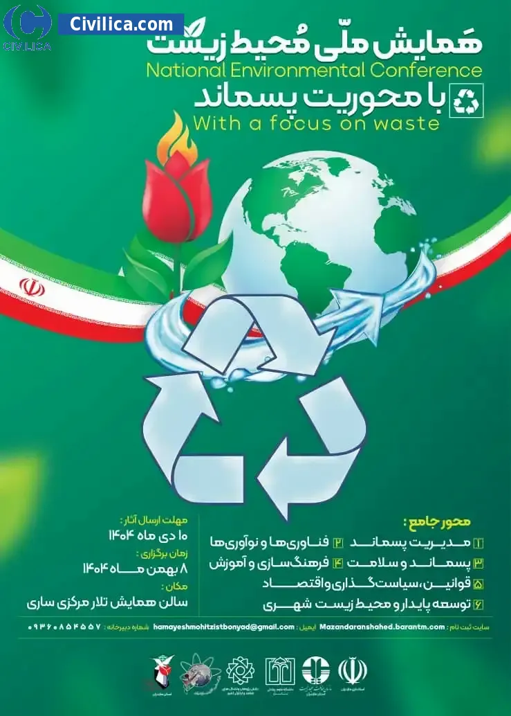 همایش ملی محیط زیست با محوریت پسماند در تاریخ ۸ بهمن ۱۴۰۴ توسط ،اداره کل دفتر دانش پژوهان و تشکل های شاهد و ایثارگر اداره کل بنیاد شهید و امور ایثارگران استان مازندران در شهر ساری برگزار خواهد شد.با توجه به اینکه این همایش به صورت رسمی برگزار می گردد، کلیه مقالات این کنفرانس در پایگاه سیویلیکا و نیز کنسرسیوم محتوای ملی نمایه خواهد شد و شما می توانید با اطمینان کامل، مقالات خود را در این همایش ارائه نموده و از امتیازات علمی ارائه مقاله کنفرانس با دریافت گواهی کنفرانس استفاده نمایید.