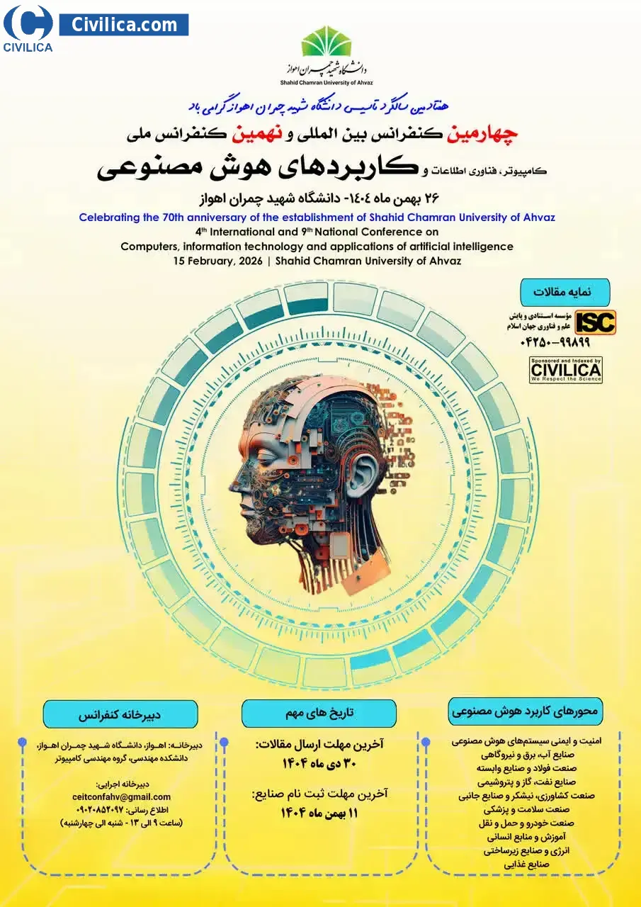چهارمین کنفرانس بین المللی و نهمین کنفرانس ملی کامپیوتر، فناوری اطلاعات و کاربردهای هوش مصنوعی در تاریخ ۲۶ بهمن ۱۴۰۴ توسط دانشگاه شهید چمران اهواز، در شهر اهواز برگزار خواهد شد.با توجه به اینکه این همایش به صورت رسمی برگزار می گردد، کلیه مقالات این کنفرانس در پایگاه سیویلیکا و نیز کنسرسیوم محتوای ملی نمایه خواهد شد و شما می توانید با اطمینان کامل، مقالات خود را در این همایش ارائه نموده و از امتیازات علمی ارائه مقاله کنفرانس با دریافت گواهی کنفرانس استفاده نمایید.