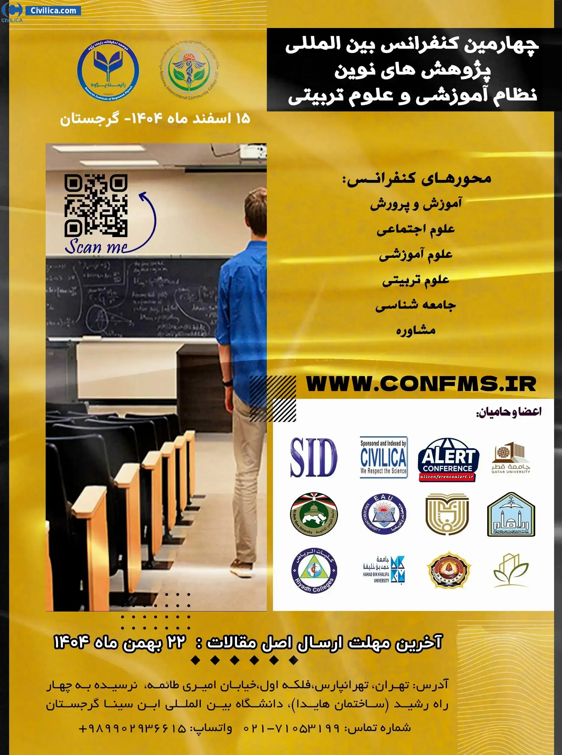 چهارمین کنفرانس بین المللی پژوهش های نوین نظام آموزشی و علوم تربیتی در تاریخ ۱۵ اسفند ۱۴۰۴ توسط ،دانشگاه بین المللی ابن سینا گرجستان با همکاری موسسه تحقیقاتی رایمند پژوه برگزار خواهد شد.با توجه به اینکه این همایش به صورت رسمی برگزار می گردد، کلیه مقالات این کنفرانس در پایگاه سیویلیکا و نیز کنسرسیوم محتوای ملی نمایه خواهد شد و شما می توانید با اطمینان کامل، مقالات خود را در این همایش ارائه نموده و از امتیازات علمی ارائه مقاله کنفرانس با دریافت گواهی کنفرانس استفاده نمایید.