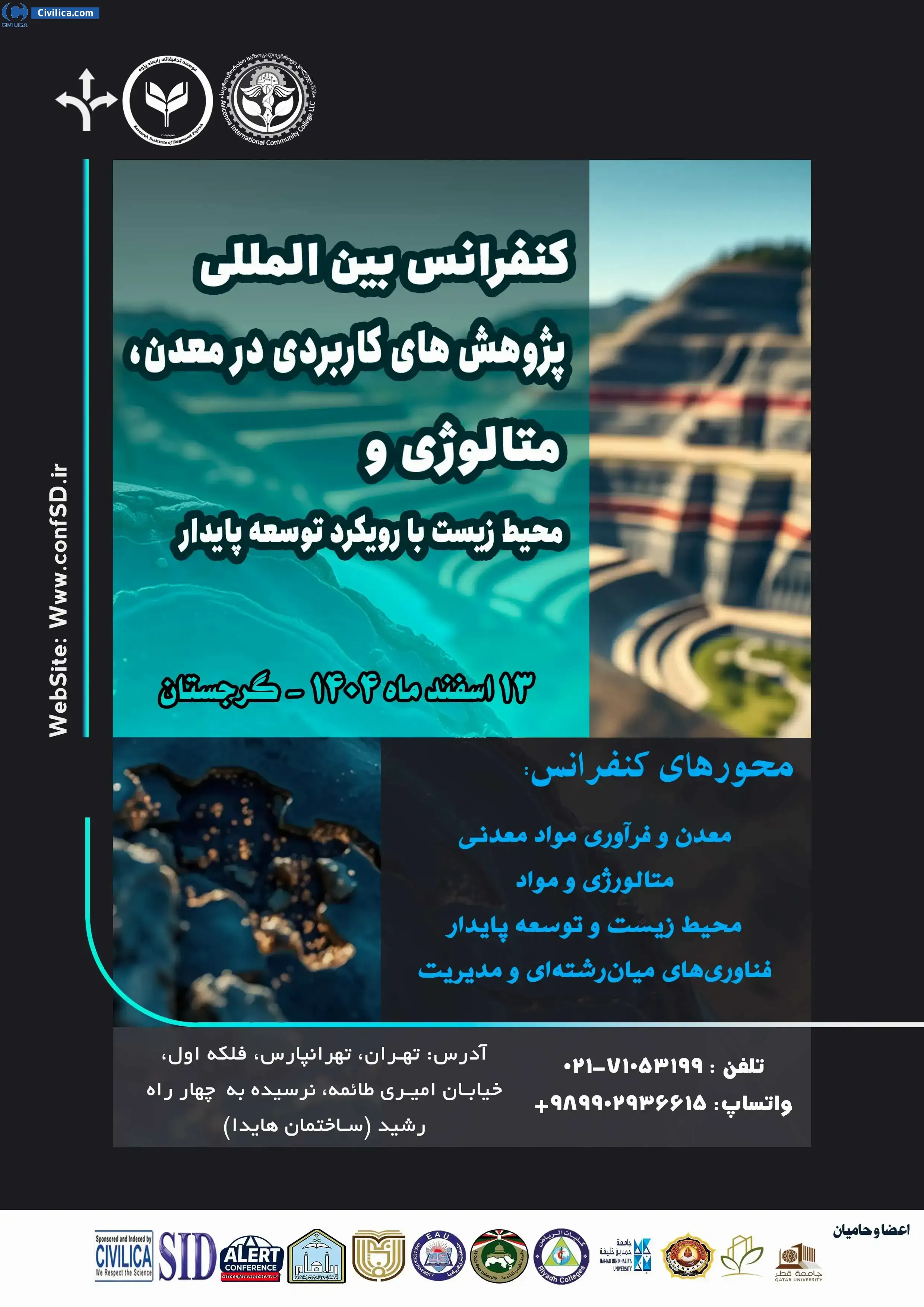 کنفرانس بین المللی پژوهش های کاربردی در معدن، متالوژی و محیط زیست با رویکرد توسعه پایدار در تاریخ ۱۳ اسفند ۱۴۰۴ توسط ،دانشگاه بین المللی ابن سینا گرجستان با همکاری موسسه تحقیقاتی رایمند پژوه برگزار خواهد شد.با توجه به اینکه این همایش به صورت رسمی برگزار می گردد، کلیه مقالات این کنفرانس در پایگاه سیویلیکا و نیز کنسرسیوم محتوای ملی نمایه خواهد شد و شما می توانید با اطمینان کامل، مقالات خود را در این همایش ارائه نموده و از امتیازات علمی ارائه مقاله کنفرانس با دریافت گواهی کنفرانس استفاده نمایید.
