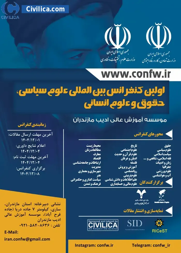 اولین کنفرانس بین المللی علوم سیاسی، حقوق و علوم انسانی در تاریخ ۸ اسفند ۱۴۰۴ توسط موسسه آموزش عالی ادیب مازندران،مرکز علمی تقدیس در شهر ساری برگزار خواهد شد.با توجه به اینکه این همایش به صورت رسمی برگزار می گردد، کلیه مقالات این کنفرانس در پایگاه سیویلیکا و نیز کنسرسیوم محتوای ملی نمایه خواهد شد و شما می توانید با اطمینان کامل، مقالات خود را در این همایش ارائه نموده و از امتیازات علمی ارائه مقاله کنفرانس با دریافت گواهی کنفرانس استفاده نمایید.