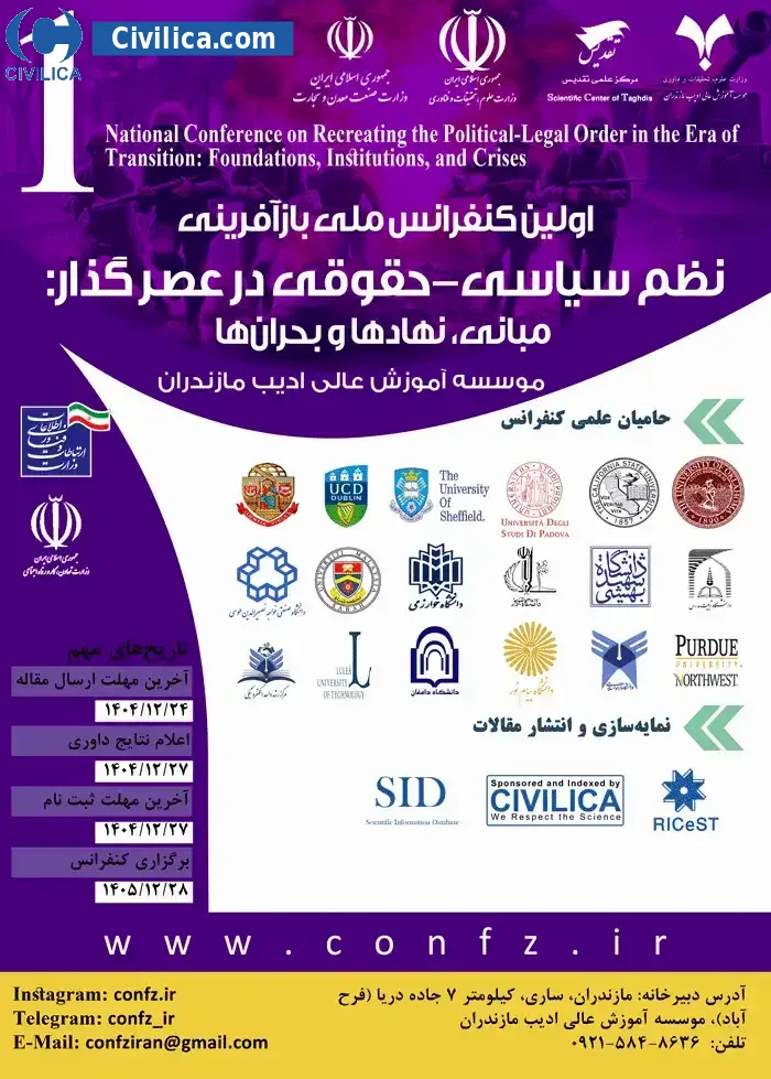 اولین کنفرانس ملی بازآفرینی نظم سیاسی-حقوقی در عصر گذار: مبانی، نهادها و بحران ها در تاریخ ۲۸ اسفند ۱۴۰۵ توسط موسسه آموزش عالی ادیب مازندران،مرکز علمی تقدیس در شهر ساری برگزار خواهد شد.با توجه به اینکه این همایش به صورت رسمی برگزار می گردد، کلیه مقالات این کنفرانس در پایگاه سیویلیکا و نیز کنسرسیوم محتوای ملی نمایه خواهد شد و شما می توانید با اطمینان کامل، مقالات خود را در این همایش ارائه نموده و از امتیازات علمی ارائه مقاله کنفرانس با دریافت گواهی کنفرانس استفاده نمایید.