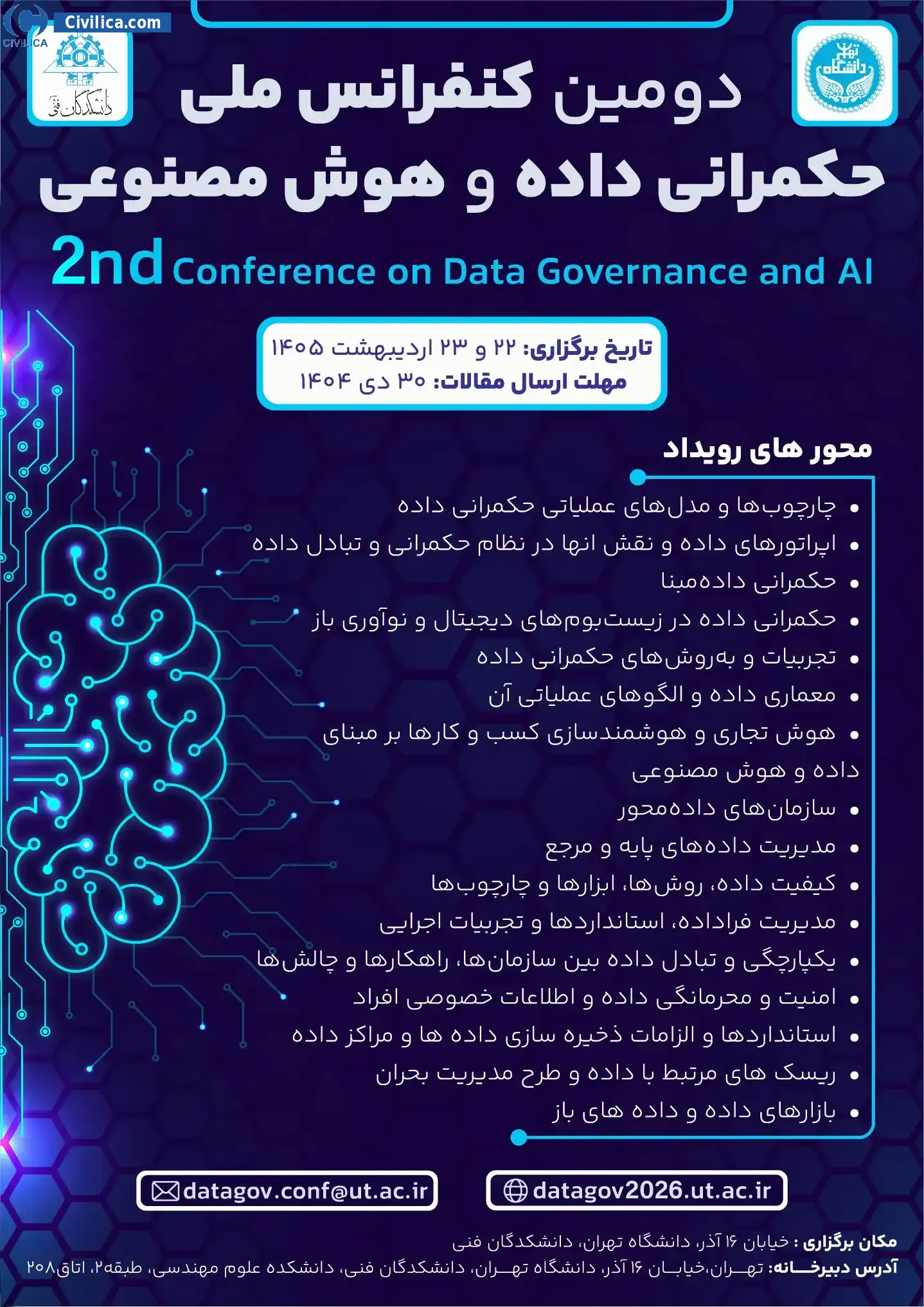 دومین کنفرانس ملی حکمرانی داده و هوش مصنوعی در تاریخ ۲۲ اردیبهشت ۱۴۰۵ توسط دانشگاه تهران،دانشکده فنی دانشگاه تهران در شهر تهران برگزار خواهد شد.با توجه به اینکه این همایش به صورت رسمی برگزار می گردد، کلیه مقالات این کنفرانس در پایگاه سیویلیکا و نیز کنسرسیوم محتوای ملی نمایه خواهد شد و شما می توانید با اطمینان کامل، مقالات خود را در این همایش ارائه نموده و از امتیازات علمی ارائه مقاله کنفرانس با دریافت گواهی کنفرانس استفاده نمایید.
