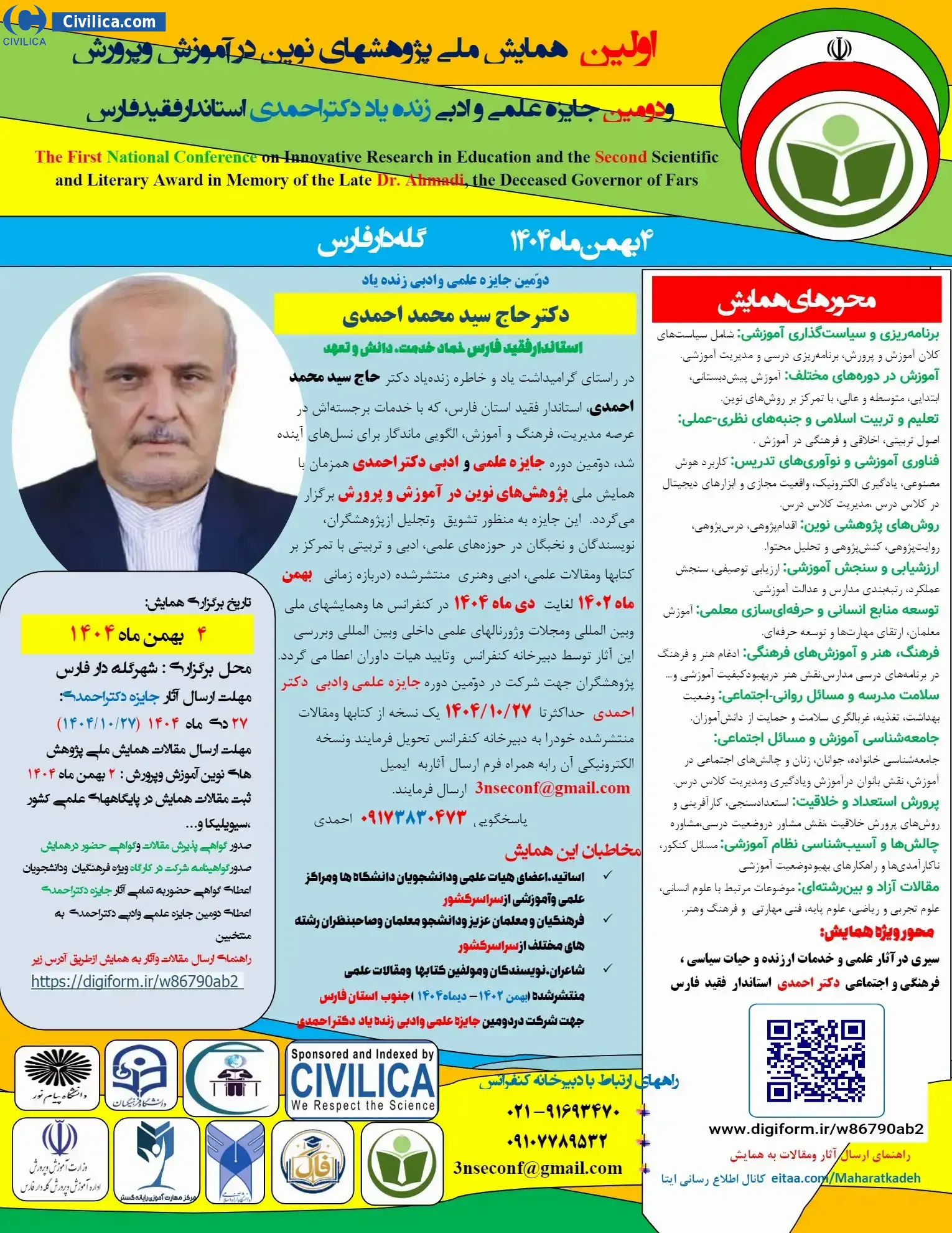 اولین همایش ملی پژوهش های نوین در آموزش وپرورش ودومین جایزه علمی وادبی زنده یاد دکترسید محمداحمدی استاندار فقید فارس در تاریخ ۴ بهمن ۱۴۰۴ توسط ،دانشگاهها ومراکز علمی آموزشی ودانشگاهی ، مرکز مهارت آموزی رایانه گستر،ادارات آموزش وپرورش و ستاد جایزه علمی وادبی دکنر احمدی موسسات علمی آموزشی دانشگاهی در شهر گله دار برگزار خواهد شد.با توجه به اینکه این همایش به صورت رسمی برگزار می گردد، کلیه مقالات این کنفرانس در پایگاه سیویلیکا و نیز کنسرسیوم محتوای ملی نمایه خواهد شد و شما می توانید با اطمینان کامل، مقالات خود را در این همایش ارائه نموده و از امتیازات علمی ارائه مقاله کنفرانس با دریافت گواهی کنفرانس استفاده نمایید.