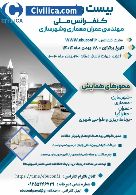 بیست و نهمین کنفرانس ملی مهندسی عمران، معماری و شهرسازی در تاریخ ۲۸ بهمن ۱۴۰۴ توسط ،موسسه پایاشهرمجله علمی تخصصی پایاشهر دبیر خانه دائمی کنفرانس در شهر شیروان برگزار خواهد شد.با توجه به اینکه این همایش به صورت رسمی برگزار می گردد، کلیه مقالات این کنفرانس در پایگاه سیویلیکا و نیز کنسرسیوم محتوای ملی نمایه خواهد شد و شما می توانید با اطمینان کامل، مقالات خود را در این همایش ارائه نموده و از امتیازات علمی ارائه مقاله کنفرانس با دریافت گواهی کنفرانس استفاده نمایید.
