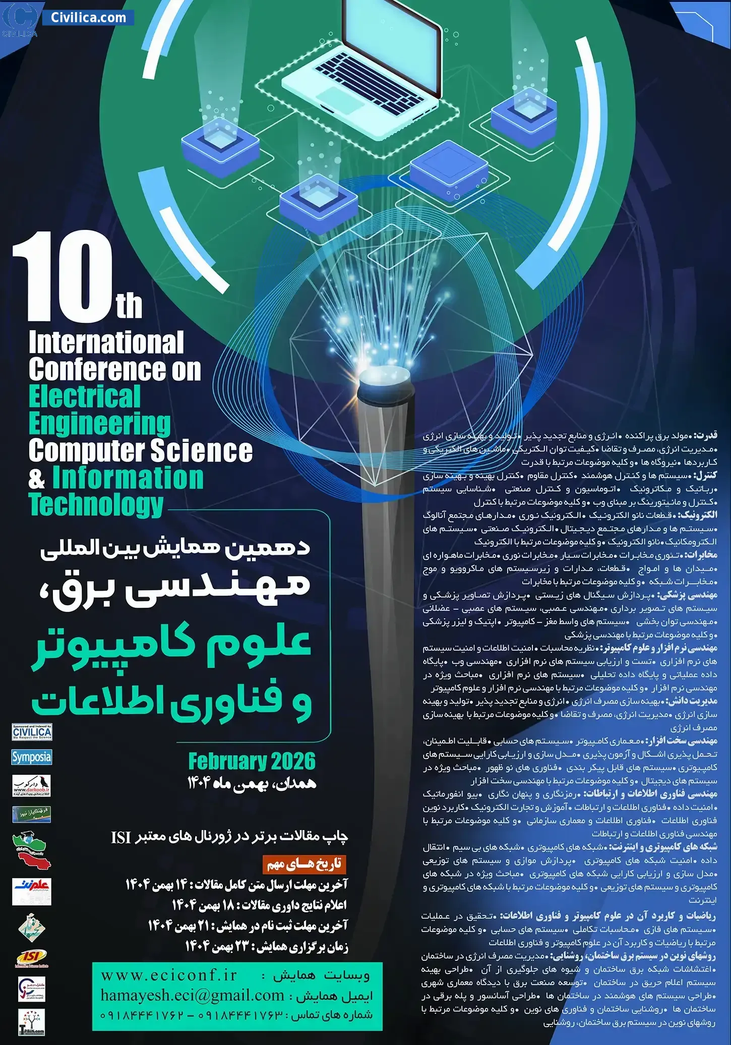 دهمین همایش بین المللی مهندسی برق، علوم کامپیوتر و فناوری اطلاعات در تاریخ ۲۳ بهمن ۱۴۰۴ توسط ،دبیرخانه دائمی کنفرانس در شهر همدان برگزار خواهد شد.با توجه به اینکه این همایش به صورت رسمی برگزار می گردد، کلیه مقالات این کنفرانس در پایگاه سیویلیکا و نیز کنسرسیوم محتوای ملی نمایه خواهد شد و شما می توانید با اطمینان کامل، مقالات خود را در این همایش ارائه نموده و از امتیازات علمی ارائه مقاله کنفرانس با دریافت گواهی کنفرانس استفاده نمایید.