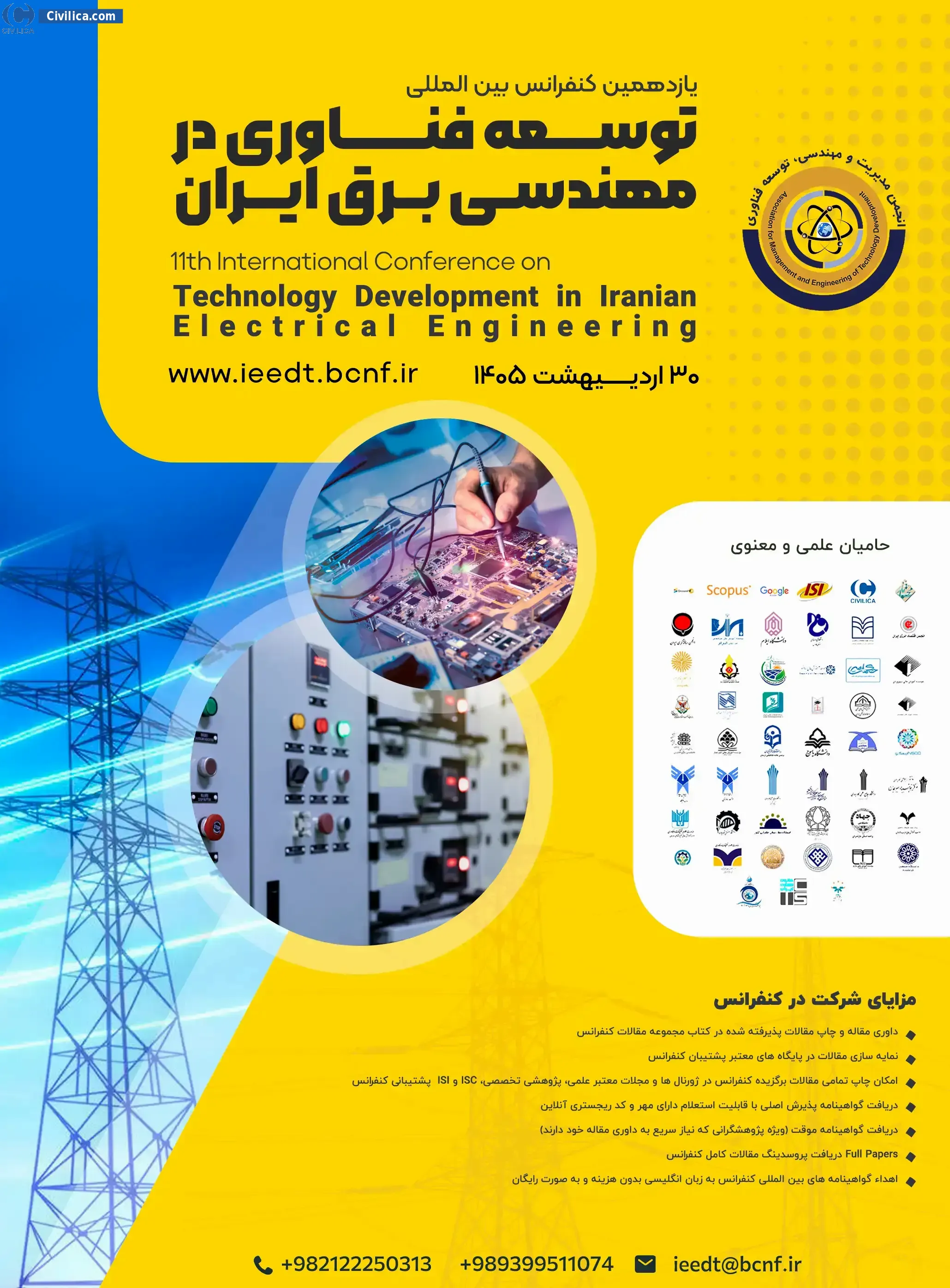 یازدهمین کنفرانس بین المللی توسعه فناوری در مهندسی برق ایران در تاریخ ۳۰ اردیبهشت ۱۴۰۵ توسط ، برگزار خواهد شد.با توجه به اینکه این همایش به صورت رسمی برگزار می گردد، کلیه مقالات این کنفرانس در پایگاه سیویلیکا و نیز کنسرسیوم محتوای ملی نمایه خواهد شد و شما می توانید با اطمینان کامل، مقالات خود را در این همایش ارائه نموده و از امتیازات علمی ارائه مقاله کنفرانس با دریافت گواهی کنفرانس استفاده نمایید.