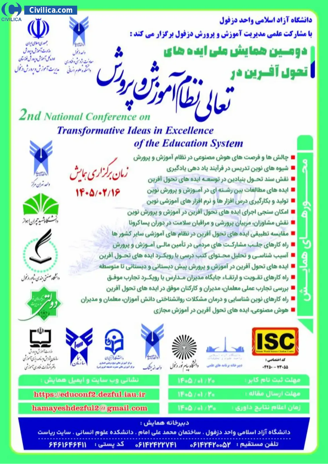 دومین همایش ملی ایده های تحول آفرین در تعالی نظام آموزش و پرورش در تاریخ ۱۶ اردیبهشت ۱۴۰۵ توسط دانشگاه آزاد اسلامی واحد دزفول،دانشگاه آزاد اسلامی واحد دزفول و اداره آموزش و پرورش شهرستان دزفول در شهر دزفول برگزار خواهد شد.با توجه به اینکه این همایش به صورت رسمی برگزار می گردد، کلیه مقالات این کنفرانس در پایگاه سیویلیکا و نیز کنسرسیوم محتوای ملی نمایه خواهد شد و شما می توانید با اطمینان کامل، مقالات خود را در این همایش ارائه نموده و از امتیازات علمی ارائه مقاله کنفرانس با دریافت گواهی کنفرانس استفاده نمایید.