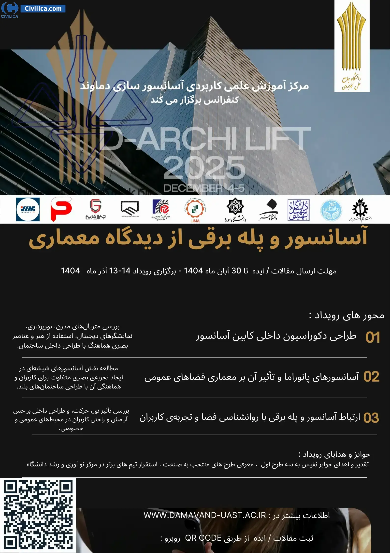 آسانسور و پله برقی از دیدگاه معماری در تاریخ ۱۳ آذر ۱۴۰۴ توسط ،دانشگاه علمی کاربردی آسانسور سازی دماوند در شهر تهران برگزار خواهد شد.با توجه به اینکه این همایش به صورت رسمی برگزار می گردد، کلیه مقالات این کنفرانس در پایگاه سیویلیکا و نیز کنسرسیوم محتوای ملی نمایه خواهد شد و شما می توانید با اطمینان کامل، مقالات خود را در این همایش ارائه نموده و از امتیازات علمی ارائه مقاله کنفرانس با دریافت گواهی کنفرانس استفاده نمایید.