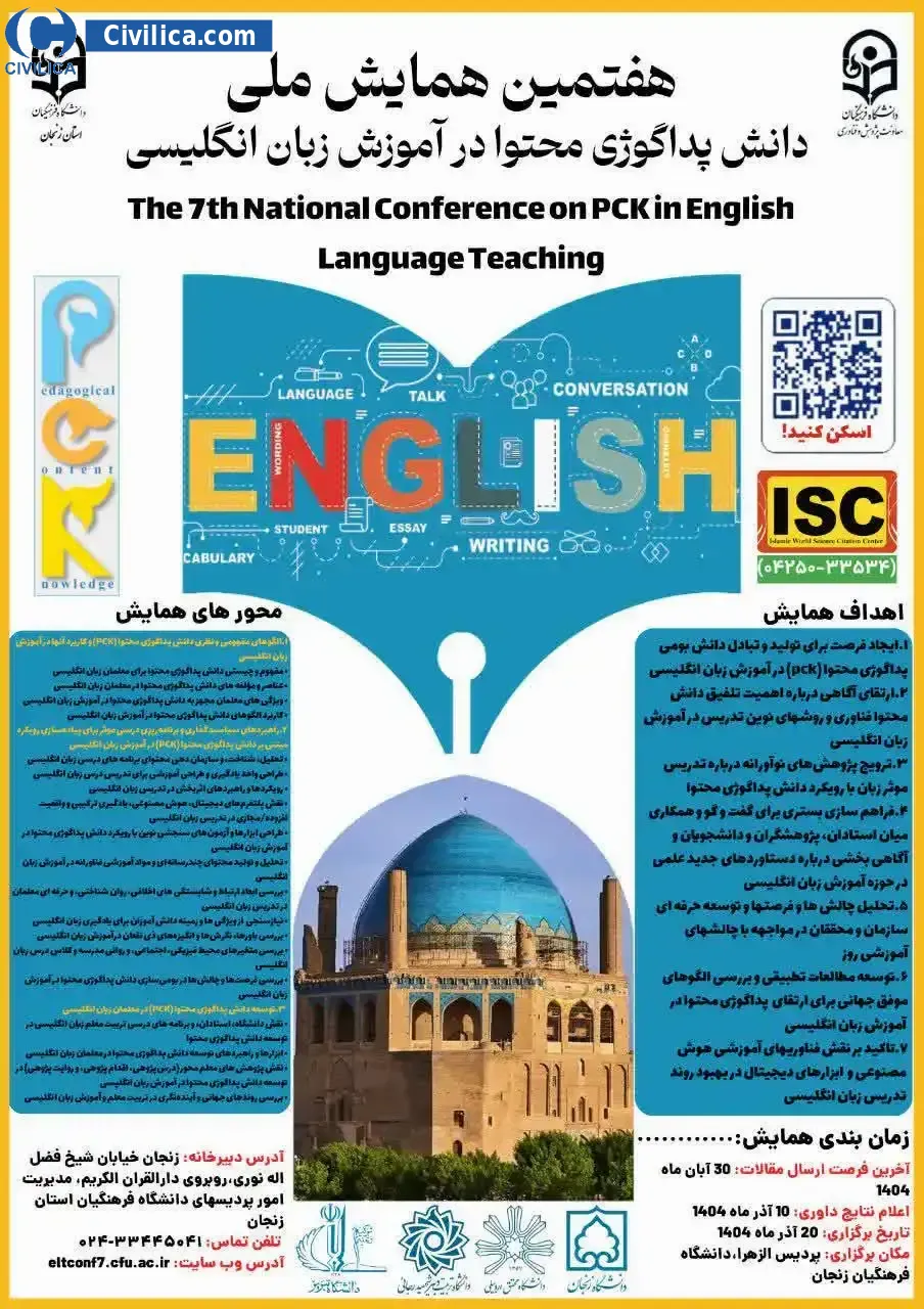هفتمین همایش ملی دانش پداگوژی محتوا در آموزش زبان انگلیسی در تاریخ ۲۰ آذر ۱۴۰۴ توسط دانشگاه فرهنگیان، در شهر زنجان برگزار خواهد شد.با توجه به اینکه این همایش به صورت رسمی برگزار می گردد، کلیه مقالات این کنفرانس در پایگاه سیویلیکا و نیز کنسرسیوم محتوای ملی نمایه خواهد شد و شما می توانید با اطمینان کامل، مقالات خود را در این همایش ارائه نموده و از امتیازات علمی ارائه مقاله کنفرانس با دریافت گواهی کنفرانس استفاده نمایید.
