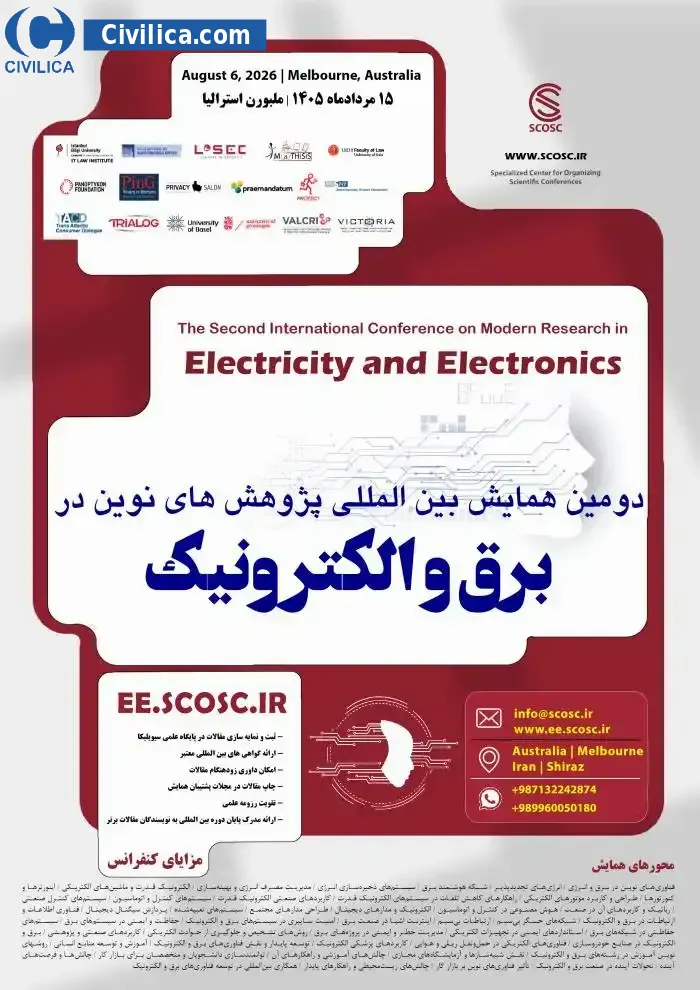 دومین همایش بین المللی پژوهش های نوین در برق و الکترونیک در تاریخ ۱۵ مرداد ۱۴۰۵ توسط ،مرکز تخصصی برگزاری همایش ها برگزار خواهد شد.با توجه به اینکه این همایش به صورت رسمی برگزار می گردد، کلیه مقالات این کنفرانس در پایگاه سیویلیکا و نیز کنسرسیوم محتوای ملی نمایه خواهد شد و شما می توانید با اطمینان کامل، مقالات خود را در این همایش ارائه نموده و از امتیازات علمی ارائه مقاله کنفرانس با دریافت گواهی کنفرانس استفاده نمایید.