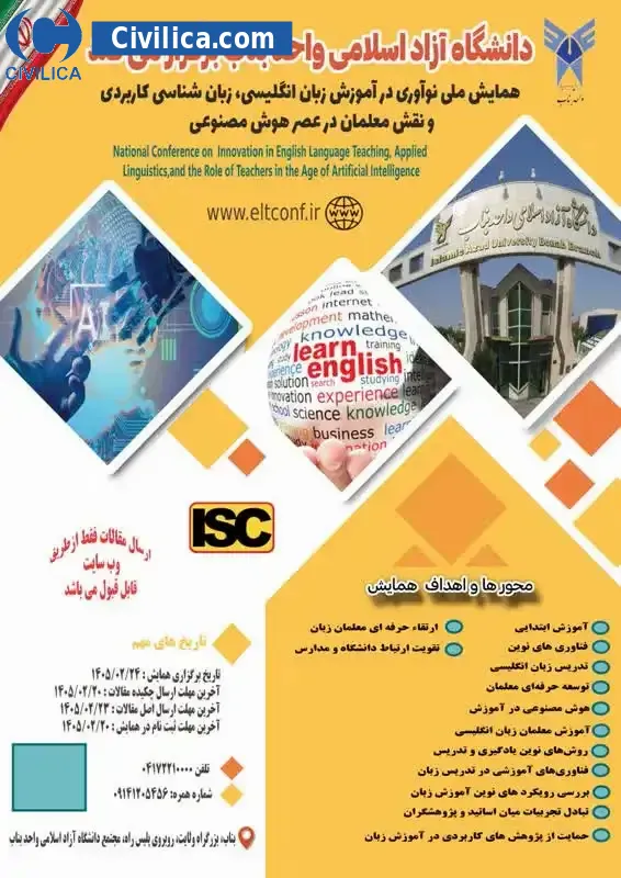 اولین همایش ملی نوآوری در آموزش زبان انگلیسی، زبان شناسی کاربردی و نقش معلمان در عصر هوش مصنوعی در تاریخ ۲۴ اردیبهشت ۱۴۰۵ توسط دانشگاه آزاد اسلامی واحد بناب، در شهر بناب برگزار خواهد شد.با توجه به اینکه این همایش به صورت رسمی برگزار می گردد، کلیه مقالات این کنفرانس در پایگاه سیویلیکا و نیز کنسرسیوم محتوای ملی نمایه خواهد شد و شما می توانید با اطمینان کامل، مقالات خود را در این همایش ارائه نموده و از امتیازات علمی ارائه مقاله کنفرانس با دریافت گواهی کنفرانس استفاده نمایید.