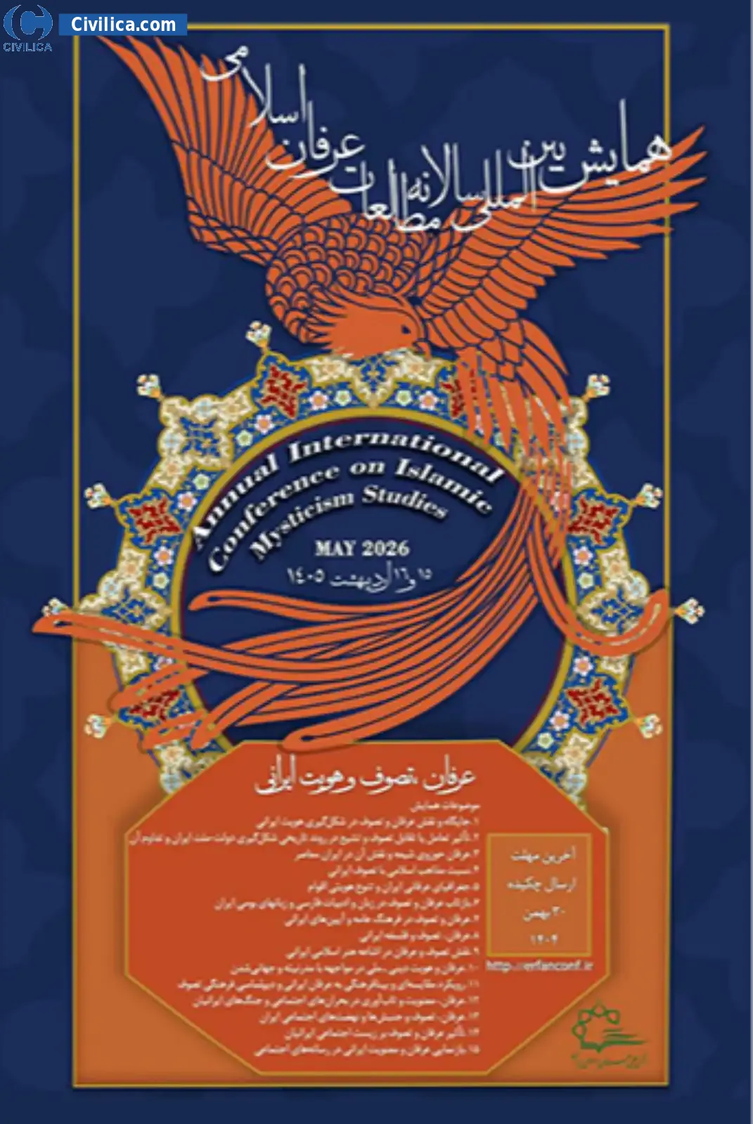 نخستین همایش بین المللی «عرفان، تصوف و هویت ایرانی» در تاریخ ۱۵ اردیبهشت ۱۴۰۵ توسط ،انجمن علمی عرفان اسلامی ایران در شهر تهران برگزار خواهد شد.با توجه به اینکه این همایش به صورت رسمی برگزار می گردد، کلیه مقالات این کنفرانس در پایگاه سیویلیکا و نیز کنسرسیوم محتوای ملی نمایه خواهد شد و شما می توانید با اطمینان کامل، مقالات خود را در این همایش ارائه نموده و از امتیازات علمی ارائه مقاله کنفرانس با دریافت گواهی کنفرانس استفاده نمایید.
