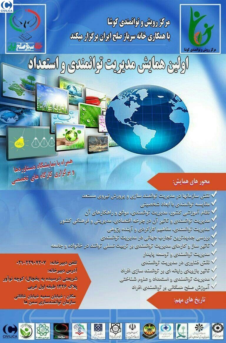 اولین همایش مدیریت توانمندسازی و استعداد در تاریخ ۲۹ آذر ۱۳۹۷ توسط ،مركز رويش و توانمد سازي كوشا - خانه سرباز صلح ايران در شهر تهران برگزار گردید. شما می توانید برای دریافت کلیه مقالات پذیرفته شده در این کنفرانس به صفحه مجموعه مقالات اولین همایش مدیریت توانمندسازی و استعداد مراجعه فرمایید.