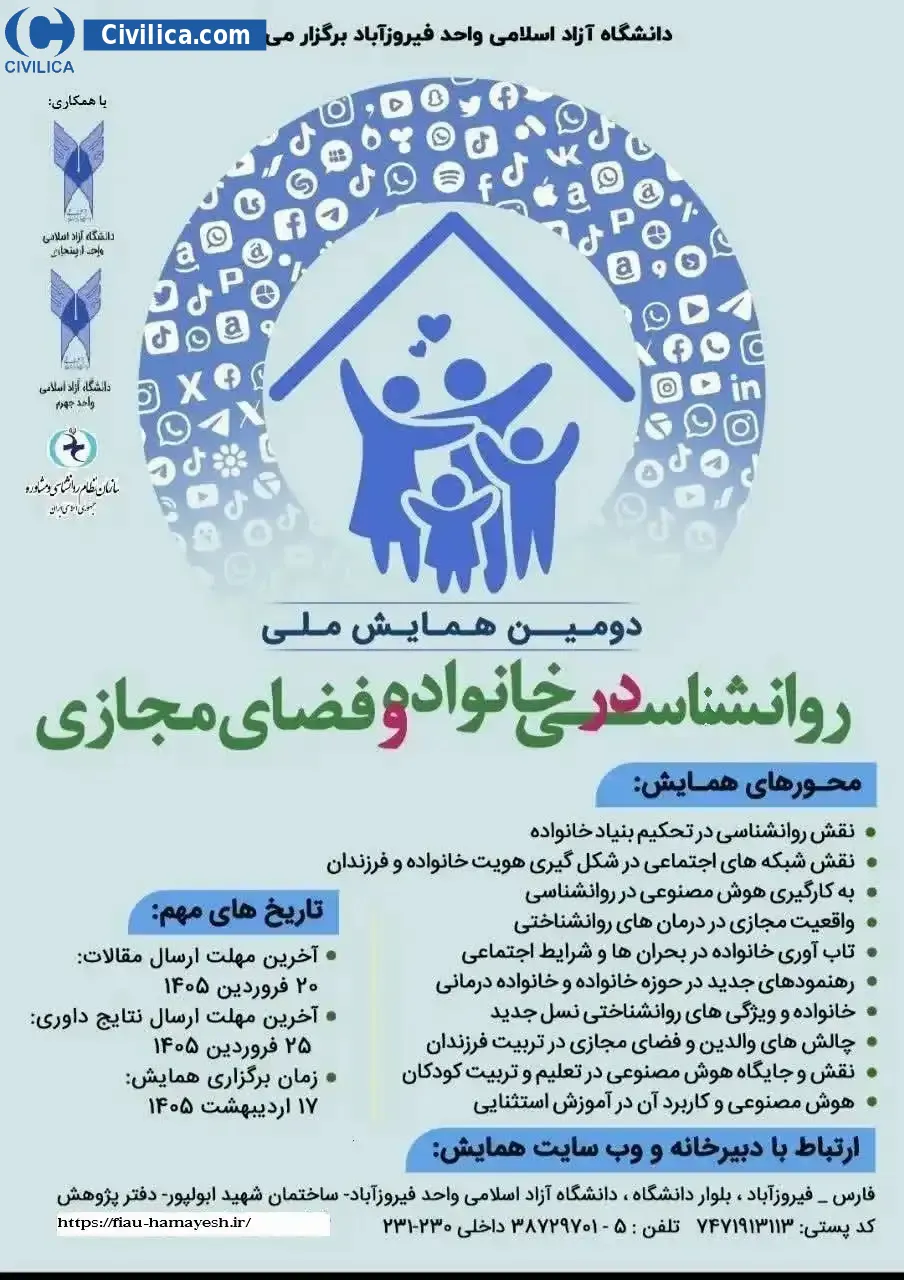 دومین همایش ملی روانشناسی در خانواده و فضای مجازی در تاریخ ۱۷ اردیبهشت ۱۴۰۵ توسط دانشگاه آزاد اسلامی واحد فیروزآباد، در شهر فیروزآباد برگزار خواهد شد.با توجه به اینکه این همایش به صورت رسمی برگزار می گردد، کلیه مقالات این کنفرانس در پایگاه سیویلیکا و نیز کنسرسیوم محتوای ملی نمایه خواهد شد و شما می توانید با اطمینان کامل، مقالات خود را در این همایش ارائه نموده و از امتیازات علمی ارائه مقاله کنفرانس با دریافت گواهی کنفرانس استفاده نمایید.