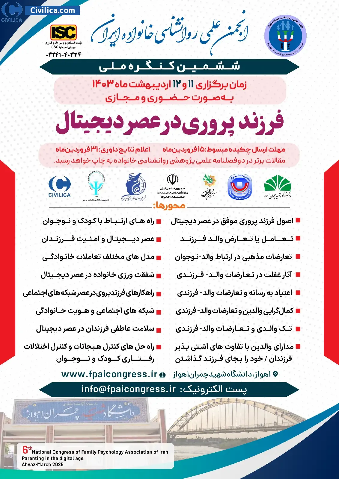 ششمین کنگره ملی انجمن علمی روانشناسی خانواده ایران با محوریت فرزندپروری در عصر دیجیتال در تاریخ ۱۱ اردیبهشت ۱۴۰۴ توسط دانشگاه شهید چمران اهواز، در شهر اهواز برگزار گردید.این همایش تحت حمایت سیویلیکا بوده است و به محض اتمام مراحل نمایه سازی، مقالات آن از طریق همین پایگاه منتشر خواهد شد.