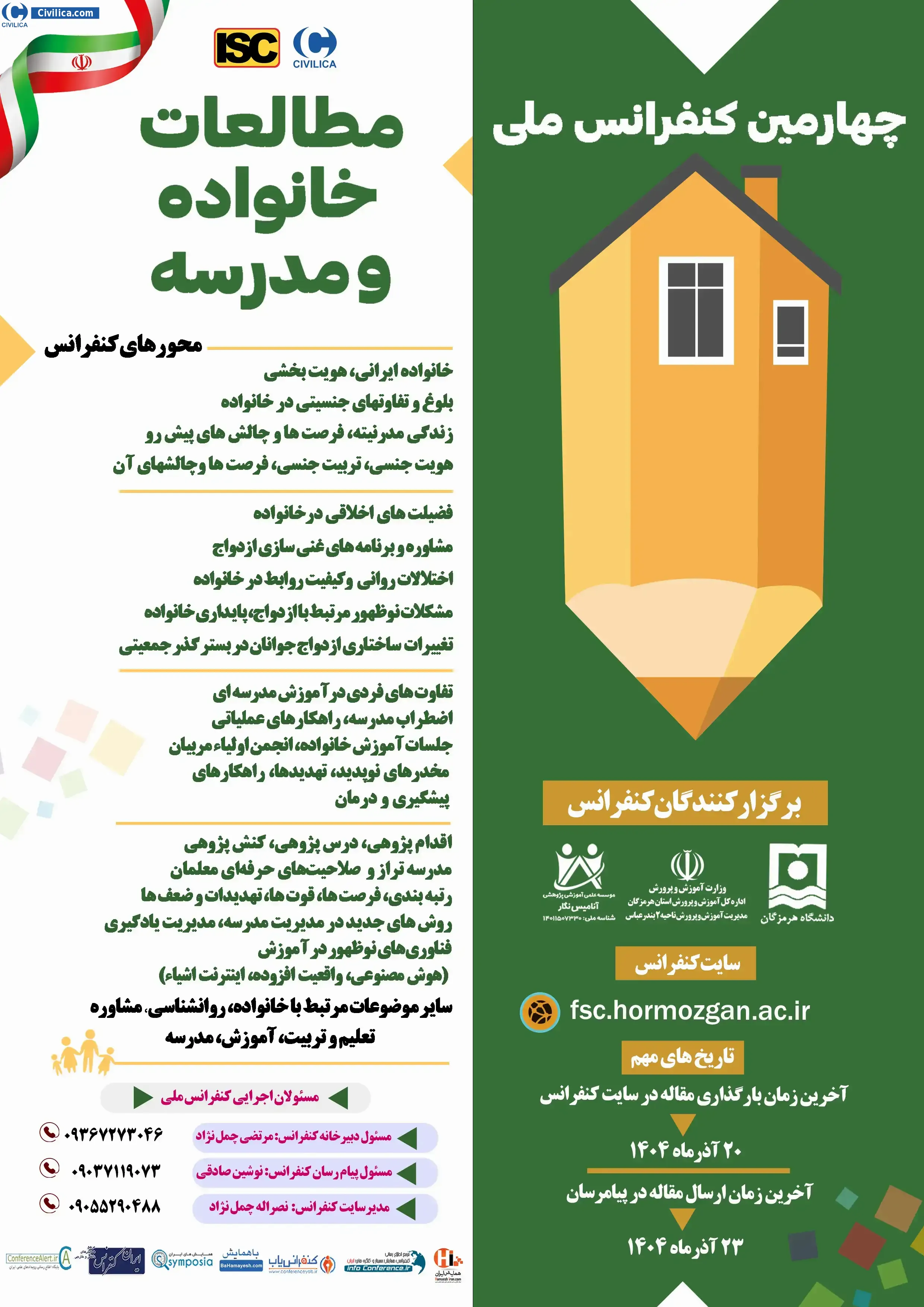 چهارمین کنفرانس ملی مطالعات خانواده و مدرسه در تاریخ ۳۰ آذر ۱۴۰۴ توسط دانشگاه هرمزگان،موسسه علمی آموزشی پژوهشی آنامیس نگارمدیریت آموزش و پرورش ناحیه دو بندرعباس در شهر بندرعباس برگزار خواهد شد.با توجه به اینکه این همایش به صورت رسمی برگزار می گردد، کلیه مقالات این کنفرانس در پایگاه سیویلیکا و نیز کنسرسیوم محتوای ملی نمایه خواهد شد و شما می توانید با اطمینان کامل، مقالات خود را در این همایش ارائه نموده و از امتیازات علمی ارائه مقاله کنفرانس با دریافت گواهی کنفرانس استفاده نمایید.