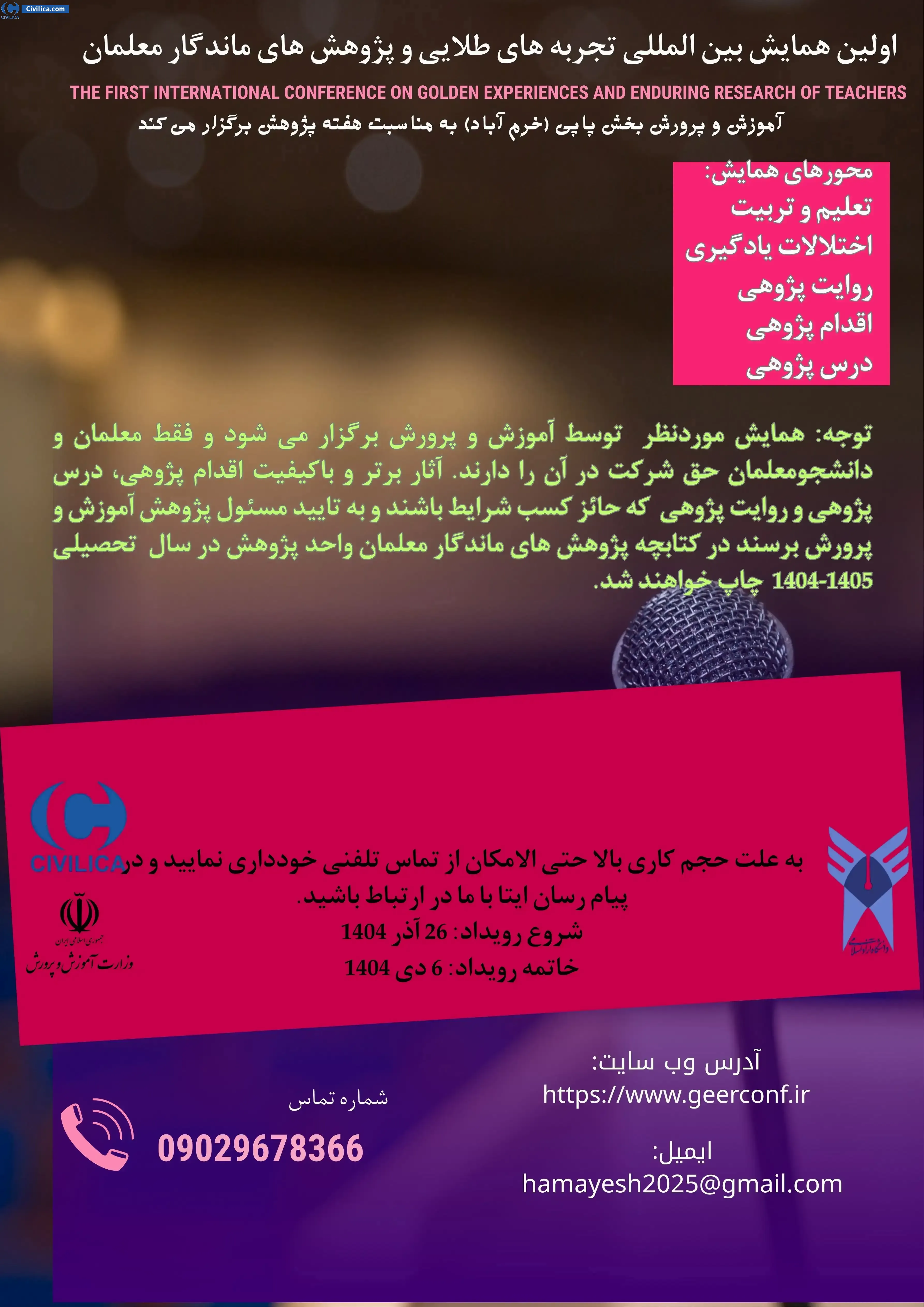 اولین همایش بین المللی تجربه های طلایی و پژوهش های ماندگار معلمان در تاریخ ۶ دی ۱۴۰۴ توسط ،اداره آموزش و پرورش در شهر خرم آباد برگزار گردید. شما می توانید برای دریافت کلیه مقالات پذیرفته شده در این کنفرانس به صفحه مجموعه مقالات اولین همایش بین المللی تجربه های طلایی و پژوهش های ماندگار معلمان مراجعه فرمایید.