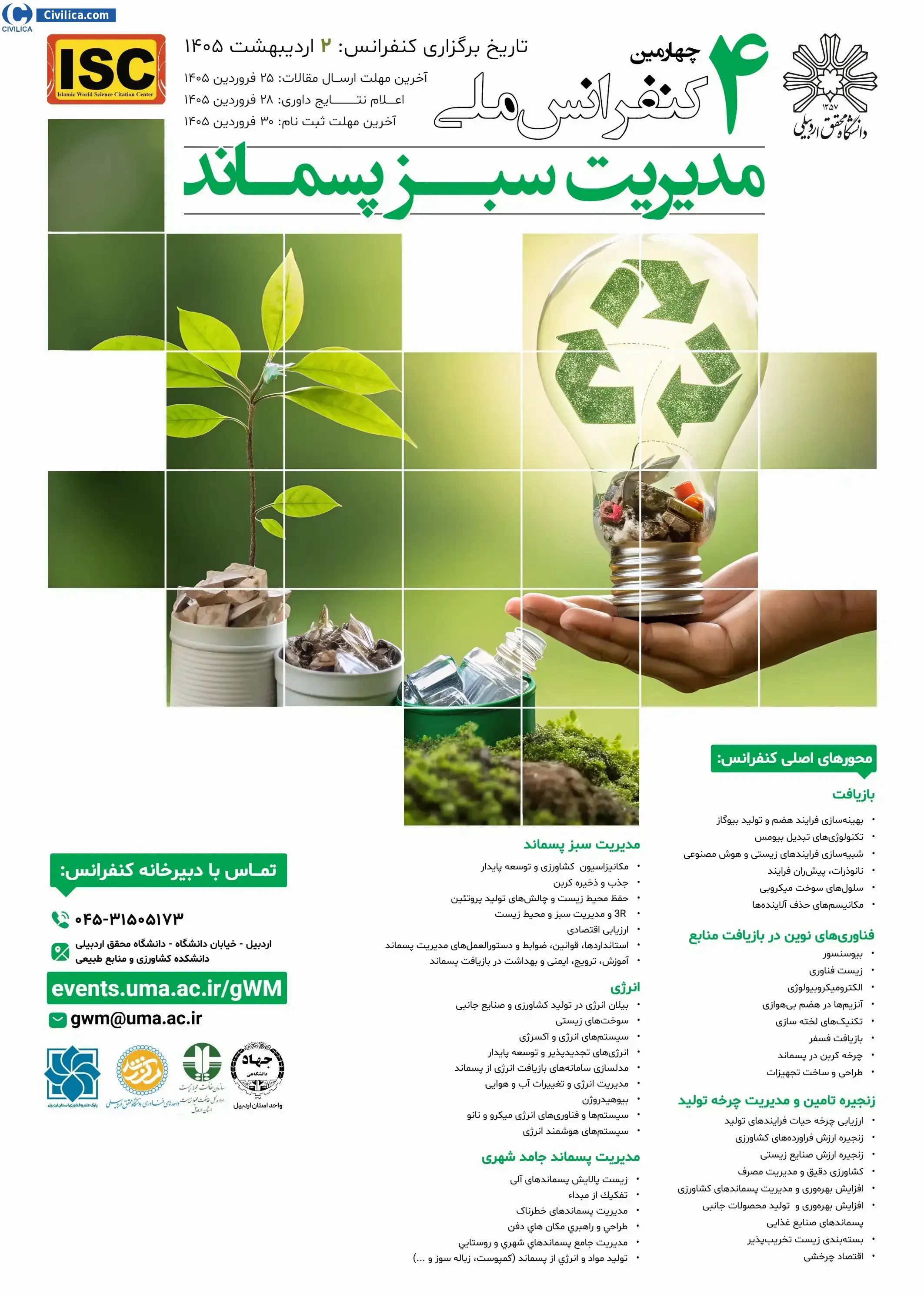 چهارمین همایش ملی مدیریت سبز پسماند در تاریخ ۲ اردیبهشت ۱۴۰۵ توسط دانشگاه محقق اردبیلی، در شهر اردبیل برگزار خواهد شد.با توجه به اینکه این همایش به صورت رسمی برگزار می گردد، کلیه مقالات این کنفرانس در پایگاه سیویلیکا و نیز کنسرسیوم محتوای ملی نمایه خواهد شد و شما می توانید با اطمینان کامل، مقالات خود را در این همایش ارائه نموده و از امتیازات علمی ارائه مقاله کنفرانس با دریافت گواهی کنفرانس استفاده نمایید.