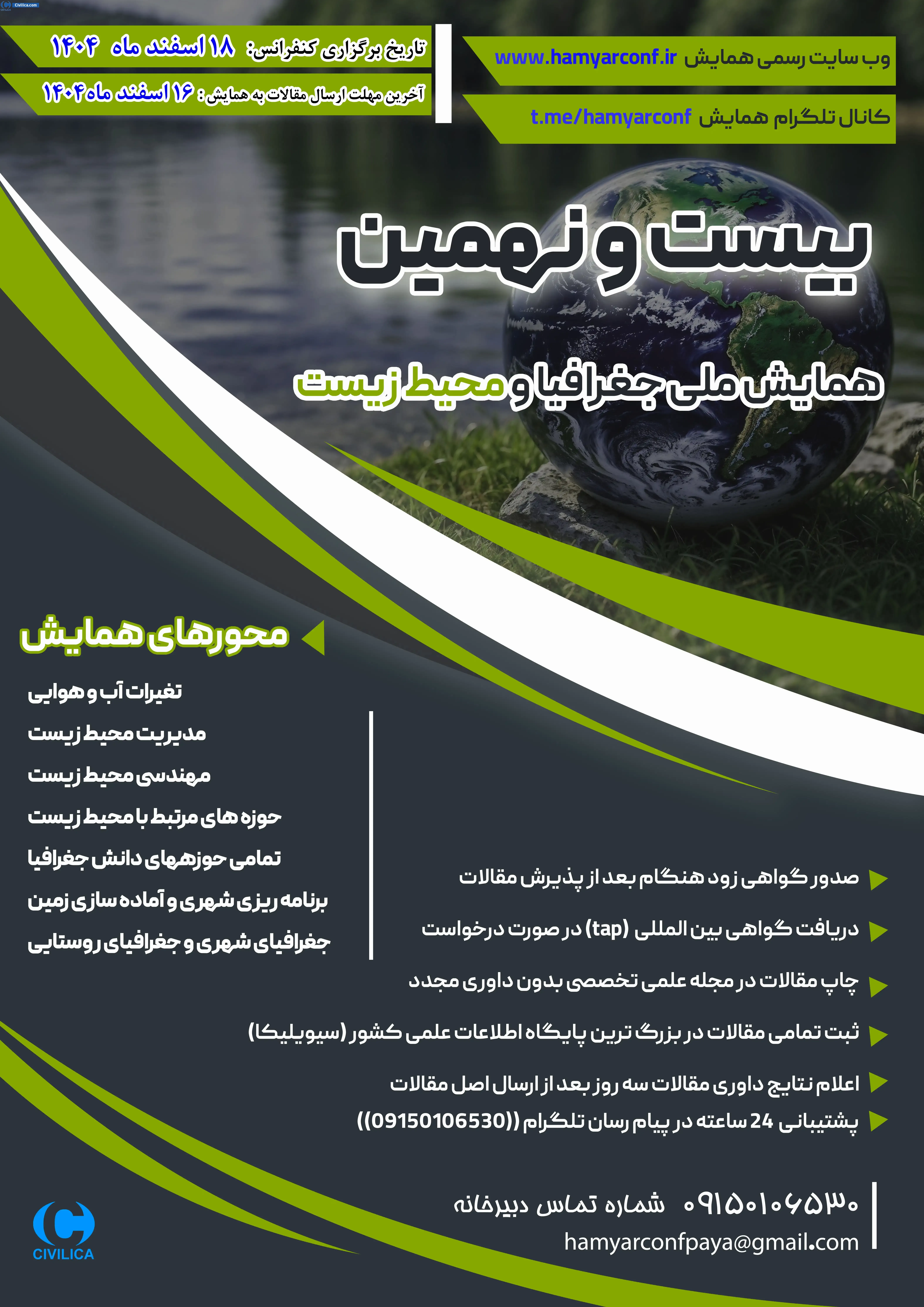 بیست و نهمین همایش ملی جغرافیا و محیط زیست در تاریخ ۱۸ اسفند ۱۴۰۴ توسط ،موسسه پایاشهر دبیرخانه دائمی کنفرانسمجله علمی تخصصی پایاشهر در شهر شیروان برگزار خواهد شد.با توجه به اینکه این همایش به صورت رسمی برگزار می گردد، کلیه مقالات این کنفرانس در پایگاه سیویلیکا و نیز کنسرسیوم محتوای ملی نمایه خواهد شد و شما می توانید با اطمینان کامل، مقالات خود را در این همایش ارائه نموده و از امتیازات علمی ارائه مقاله کنفرانس با دریافت گواهی کنفرانس استفاده نمایید.