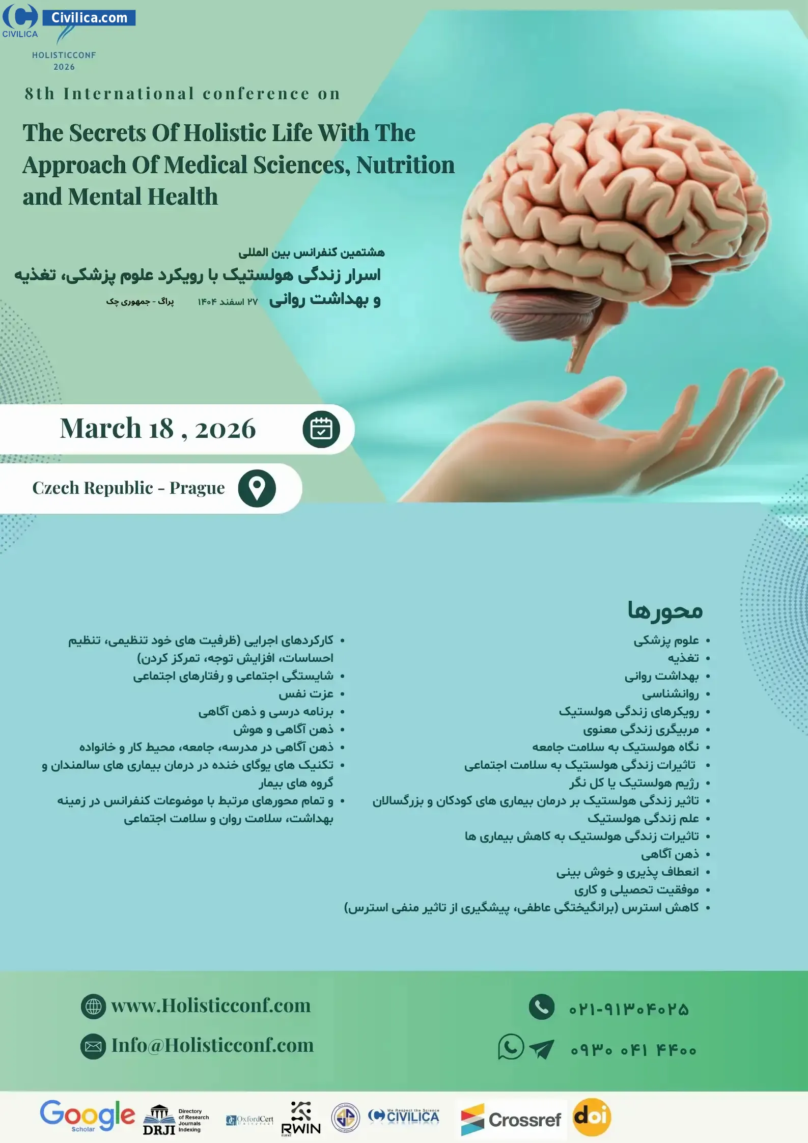 هشتمین کنفرانس بین المللی اسرار زندگی هولستیک با رویکرد علوم پزشکی، تغذیه و بهداشت روانی در تاریخ ۲۷ اسفند ۱۴۰۴ توسط ،همایش آروین البرز برگزار خواهد شد.با توجه به اینکه این همایش به صورت رسمی برگزار می گردد، کلیه مقالات این کنفرانس در پایگاه سیویلیکا و نیز کنسرسیوم محتوای ملی نمایه خواهد شد و شما می توانید با اطمینان کامل، مقالات خود را در این همایش ارائه نموده و از امتیازات علمی ارائه مقاله کنفرانس با دریافت گواهی کنفرانس استفاده نمایید.