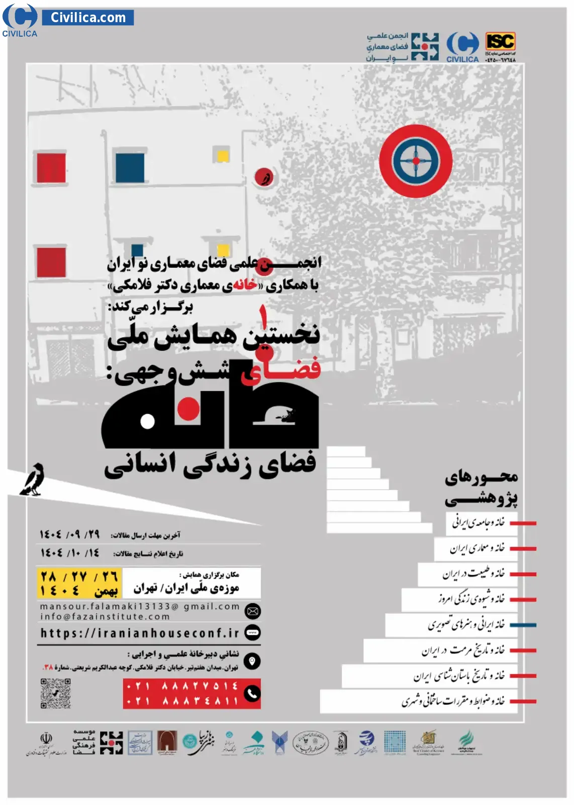 نخستین همایش ملی فضای شش وجهی:"خانه فضای زندگی انسانی" در تاریخ ۲۶ بهمن ۱۴۰۴ توسط ،انجمن فضای معماری نو ایران در شهر تهران برگزار خواهد شد.با توجه به اینکه این همایش به صورت رسمی برگزار می گردد، کلیه مقالات این کنفرانس در پایگاه سیویلیکا و نیز کنسرسیوم محتوای ملی نمایه خواهد شد و شما می توانید با اطمینان کامل، مقالات خود را در این همایش ارائه نموده و از امتیازات علمی ارائه مقاله کنفرانس با دریافت گواهی کنفرانس استفاده نمایید.