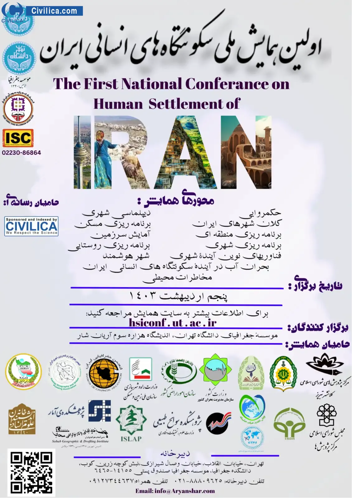 اولین همایش ملی سکونتگاه های انسانی ایران در تاریخ ۵ اردیبهشت ۱۴۰۳ توسط دانشگاه تهران،موسسه جغرافیا دانشگاه تهران اندیشگاه هزاره سوم آریان شار در شهر تهران برگزار گردید. شما می توانید برای دریافت کلیه مقالات پذیرفته شده در این کنفرانس به صفحه مجموعه مقالات اولین همایش ملی سکونتگاه های انسانی ایران مراجعه فرمایید.