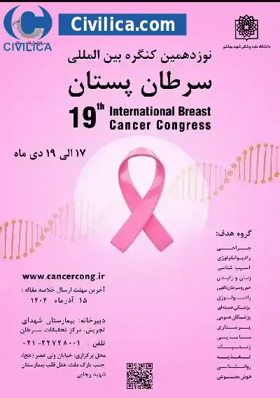 نوزدهمین کنگره بین المللی سرطان پستان در تاریخ ۱۷ دی ۱۴۰۴ توسط دانشگاه شهید بهشتی،مرکز تحقیقات سرطان دانشگاه علوم پزشکی شهید بهشتی در شهر تهران برگزار خواهد شد.این کنفرانس از طریق پایگاه سیویلیکا اطلاع رسانی میگردد و چنانچه تحت حمایت سیویلیکا قراربگیرد، پس از برگزاری، مقالات کنفرانس در پایگاه سیویلیکا و کنسرسیوم محتوای ملی نمایه خواهد شد. جهت ثبت درخواست حمایت علمی سیویلیکا از کنفرانس اینجا را کلیک کنید.