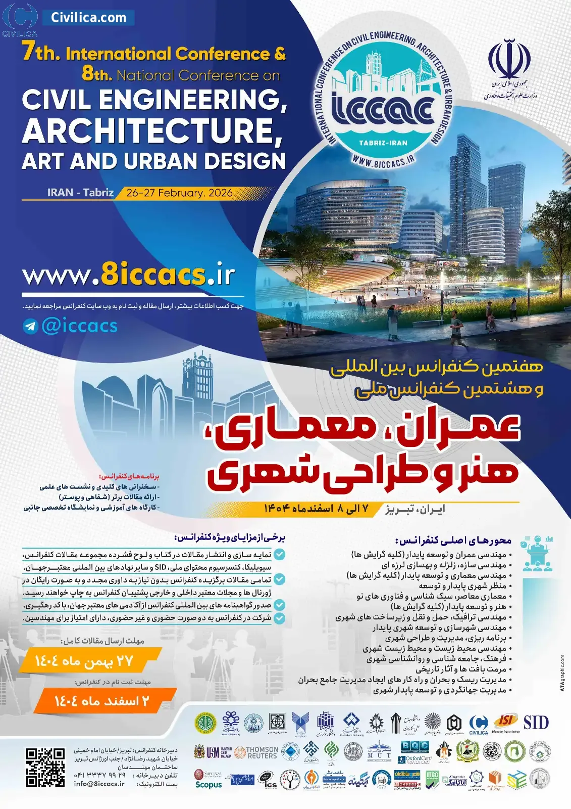هفتمین کنفرانس بین المللی و هشتمین کنفرانس ملی عمران، معماری، هنر و طراحی شهری در تاریخ ۷ اسفند ۱۴۰۴ توسط دانشگاه خوارزمی، دانشگاه شهرکرد، دانشگاه کوثر،دبیرخانه دائمی کنفرانس با همکاریو سایر دانشگاه های برجسته کشور در شهر تبریز برگزار خواهد شد.با توجه به اینکه این همایش به صورت رسمی برگزار می گردد، کلیه مقالات این کنفرانس در پایگاه سیویلیکا و نیز کنسرسیوم محتوای ملی نمایه خواهد شد و شما می توانید با اطمینان کامل، مقالات خود را در این همایش ارائه نموده و از امتیازات علمی ارائه مقاله کنفرانس با دریافت گواهی کنفرانس استفاده نمایید.