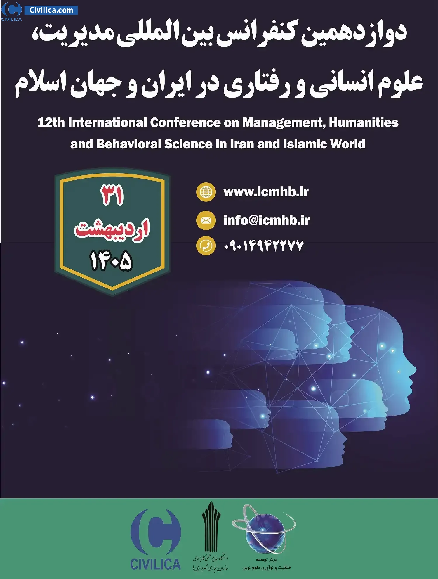 دوازدهمین کنفرانس بین المللی مدیریت، علوم انسانی و رفتاری در ایران و جهان اسلام در تاریخ ۳۱ اردیبهشت ۱۴۰۵ توسط ،دانشگاه جامع علمی کاربردی سازمان همیاری شهرداری ها و مرکز توسعه خلاقیت و نوآوری علوم نوین در شهر تهران برگزار خواهد شد.با توجه به اینکه این همایش به صورت رسمی برگزار می گردد، کلیه مقالات این کنفرانس در پایگاه سیویلیکا و نیز کنسرسیوم محتوای ملی نمایه خواهد شد و شما می توانید با اطمینان کامل، مقالات خود را در این همایش ارائه نموده و از امتیازات علمی ارائه مقاله کنفرانس با دریافت گواهی کنفرانس استفاده نمایید.