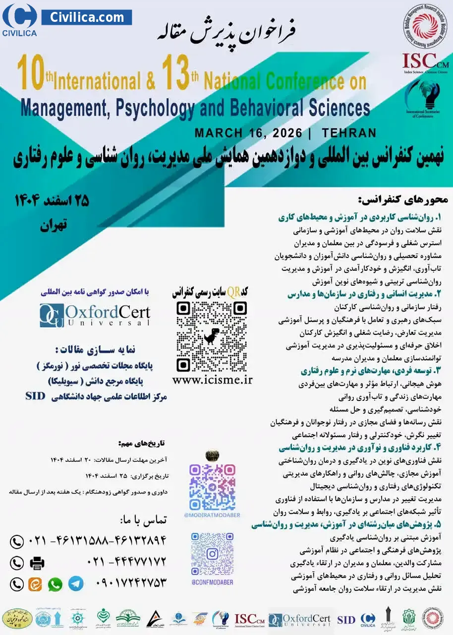 دهمین کنفرانس بین المللی و سیزدهمین همایش ملی مدیریت، روان شناسی و علوم رفتاری در تاریخ ۲۵ اسفند ۱۴۰۴ توسط ،دانشگاه علمی کاربردی خانه کارگر اسلامشهر در شهر تهران برگزار خواهد شد.با توجه به اینکه این همایش به صورت رسمی برگزار می گردد، کلیه مقالات این کنفرانس در پایگاه سیویلیکا و نیز کنسرسیوم محتوای ملی نمایه خواهد شد و شما می توانید با اطمینان کامل، مقالات خود را در این همایش ارائه نموده و از امتیازات علمی ارائه مقاله کنفرانس با دریافت گواهی کنفرانس استفاده نمایید.