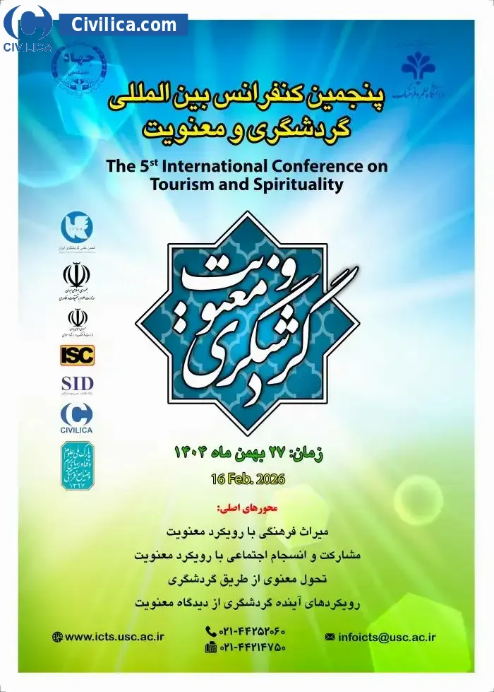 پنجمین کنفرانس بین المللی گردشگری و معنویت در تاریخ ۲۷ بهمن ۱۴۰۴ توسط دانشگاه علم و فرهنگ، در شهر تهران برگزار خواهد شد.با توجه به اینکه این همایش به صورت رسمی برگزار می گردد، کلیه مقالات این کنفرانس در پایگاه سیویلیکا و نیز کنسرسیوم محتوای ملی نمایه خواهد شد و شما می توانید با اطمینان کامل، مقالات خود را در این همایش ارائه نموده و از امتیازات علمی ارائه مقاله کنفرانس با دریافت گواهی کنفرانس استفاده نمایید.