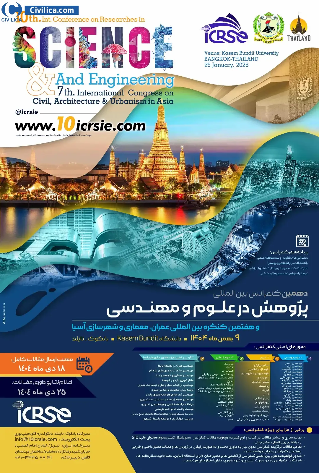دهمین کنفرانس بین المللی پژوهش در علوم و مهندسی و هفتمین کنگره بین المللی عمران، معماری و شهرسازی آسیا در تاریخ ۹ بهمن ۱۴۰۴ توسط ،دبیرخانه دائمی کنفرانس، دانشگاه Kasem Bundit بانکوک برگزار خواهد شد.با توجه به اینکه این همایش به صورت رسمی برگزار می گردد، کلیه مقالات این کنفرانس در پایگاه سیویلیکا و نیز کنسرسیوم محتوای ملی نمایه خواهد شد و شما می توانید با اطمینان کامل، مقالات خود را در این همایش ارائه نموده و از امتیازات علمی ارائه مقاله کنفرانس با دریافت گواهی کنفرانس استفاده نمایید.
