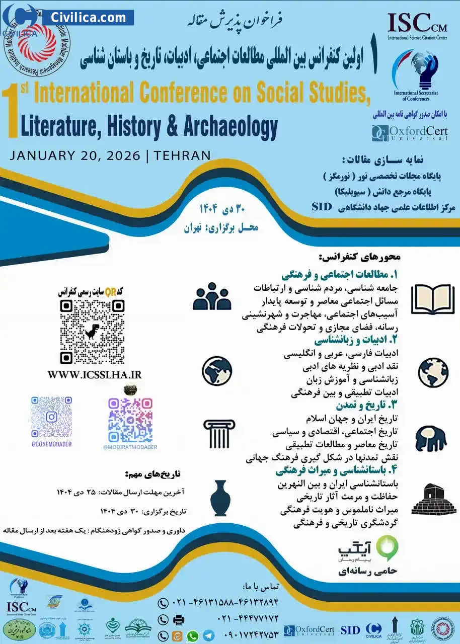 اولین کنفرانس بین المللی مطالعات اجتماعی، ادبیات، تاریخ و باستان شناسی در تاریخ ۳۰ دی ۱۴۰۴ توسط ، در شهر تهران برگزار خواهد شد.با توجه به اینکه این همایش به صورت رسمی برگزار می گردد، کلیه مقالات این کنفرانس در پایگاه سیویلیکا و نیز کنسرسیوم محتوای ملی نمایه خواهد شد و شما می توانید با اطمینان کامل، مقالات خود را در این همایش ارائه نموده و از امتیازات علمی ارائه مقاله کنفرانس با دریافت گواهی کنفرانس استفاده نمایید.