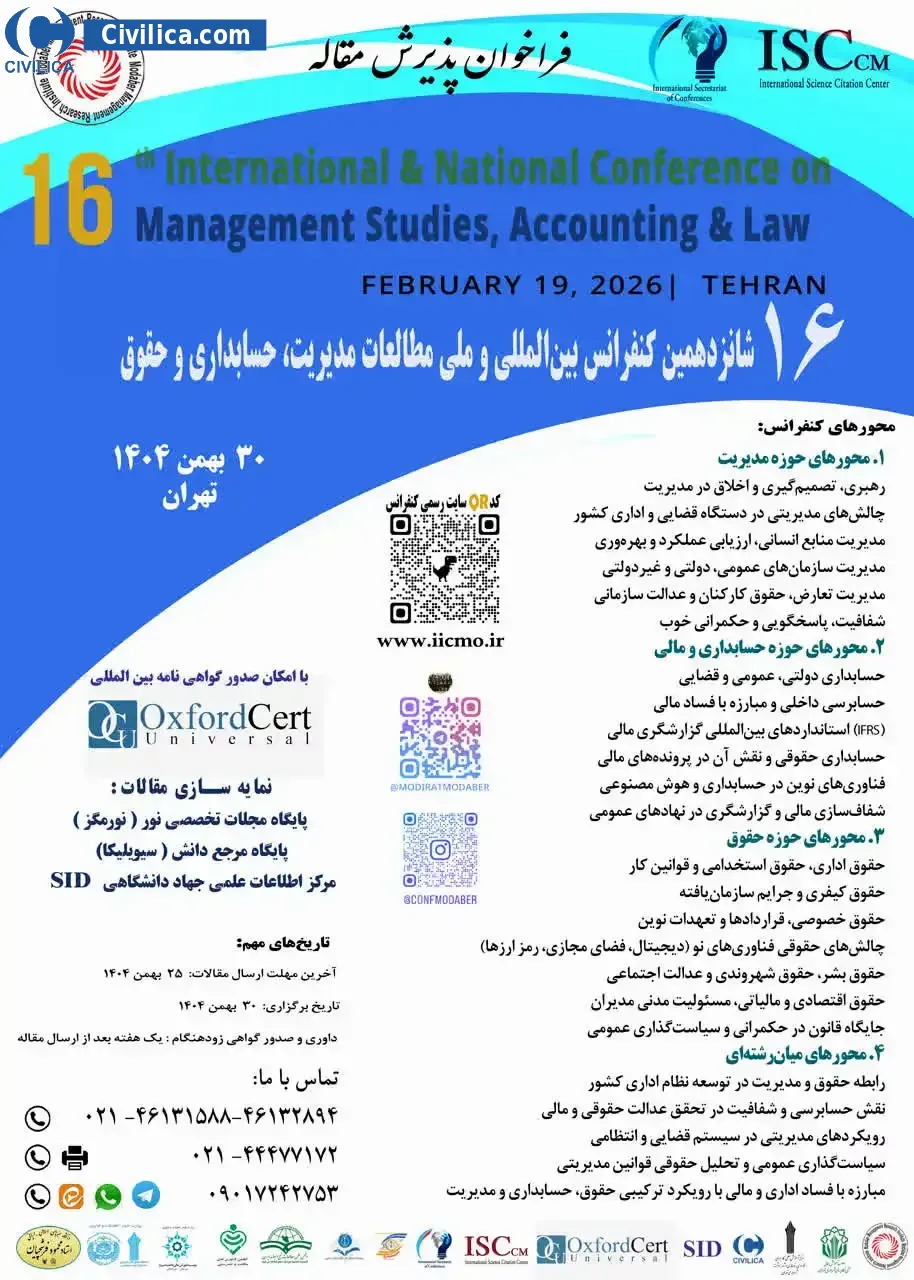 شانزدهمین کنفرانس بین المللی و ملی مطالعات مدیریت، حسابداری و حقوق در تاریخ ۳۰ بهمن ۱۴۰۴ توسط ،با مشارکت مجامع علمی در شهر تهران برگزار خواهد شد.با توجه به اینکه این همایش به صورت رسمی برگزار می گردد، کلیه مقالات این کنفرانس در پایگاه سیویلیکا و نیز کنسرسیوم محتوای ملی نمایه خواهد شد و شما می توانید با اطمینان کامل، مقالات خود را در این همایش ارائه نموده و از امتیازات علمی ارائه مقاله کنفرانس با دریافت گواهی کنفرانس استفاده نمایید.