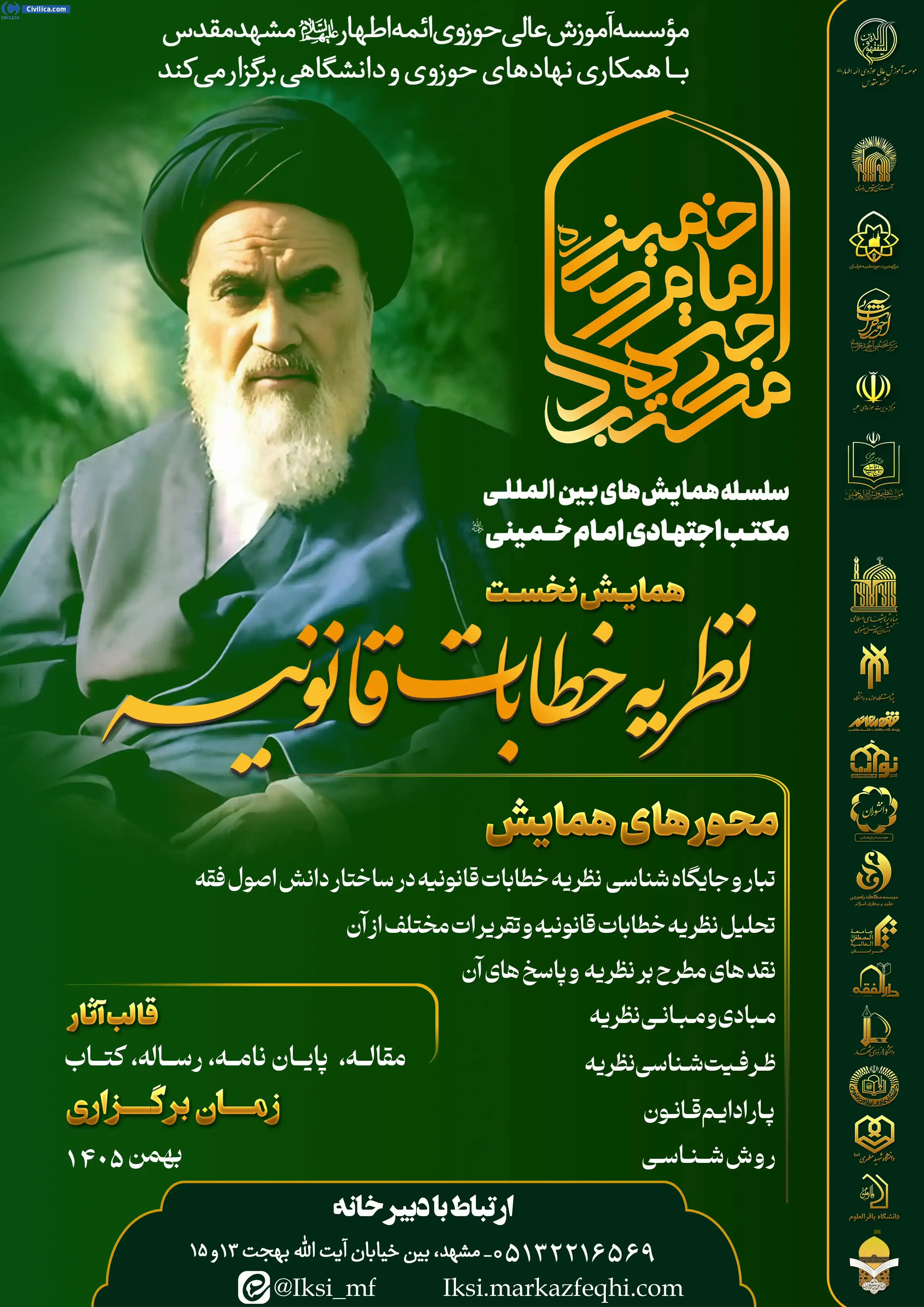 سلسله همایش های بین المللی مکتب اجتهادی امام خمینی (ره)، همایش نخست: نظریه خطابات قانونیه در تاریخ ۱۵ بهمن ۱۴۰۵ توسط ،موسسه آموزش عالی حوزوی ائمه اطهار (علیهم السلام) در شهر مشهد برگزار خواهد شد.با توجه به اینکه این همایش به صورت رسمی برگزار می گردد، کلیه مقالات این کنفرانس در پایگاه سیویلیکا و نیز کنسرسیوم محتوای ملی نمایه خواهد شد و شما می توانید با اطمینان کامل، مقالات خود را در این همایش ارائه نموده و از امتیازات علمی ارائه مقاله کنفرانس با دریافت گواهی کنفرانس استفاده نمایید.