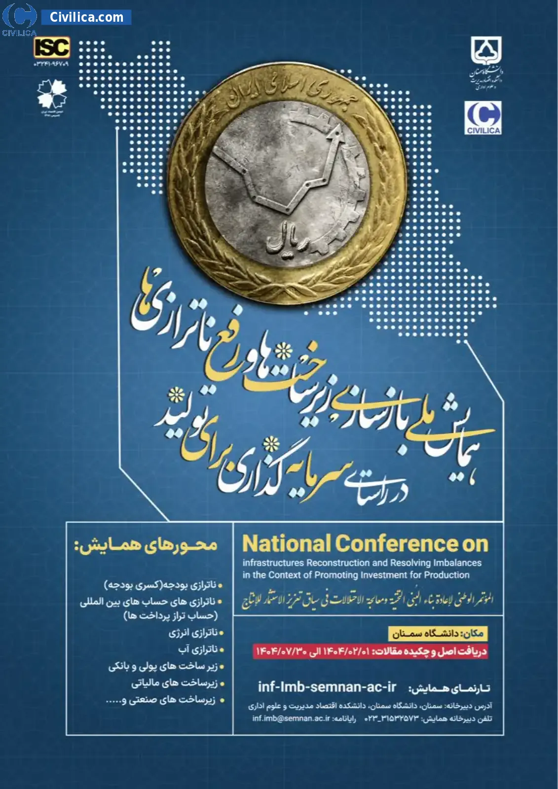 همایش ملی بازسازی زیرساخت ها و رفع ناترازی ها در راستای سرمایه گذاری برای تولید در تاریخ ۲۰ آبان ۱۴۰۴ توسط دانشگاه سمنان، در شهر سمنان برگزار خواهد شد.با توجه به اینکه این همایش به صورت رسمی برگزار می گردد، کلیه مقالات این کنفرانس در پایگاه سیویلیکا و نیز کنسرسیوم محتوای ملی نمایه خواهد شد و شما می توانید با اطمینان کامل، مقالات خود را در این همایش ارائه نموده و از امتیازات علمی ارائه مقاله کنفرانس با دریافت گواهی کنفرانس استفاده نمایید.
