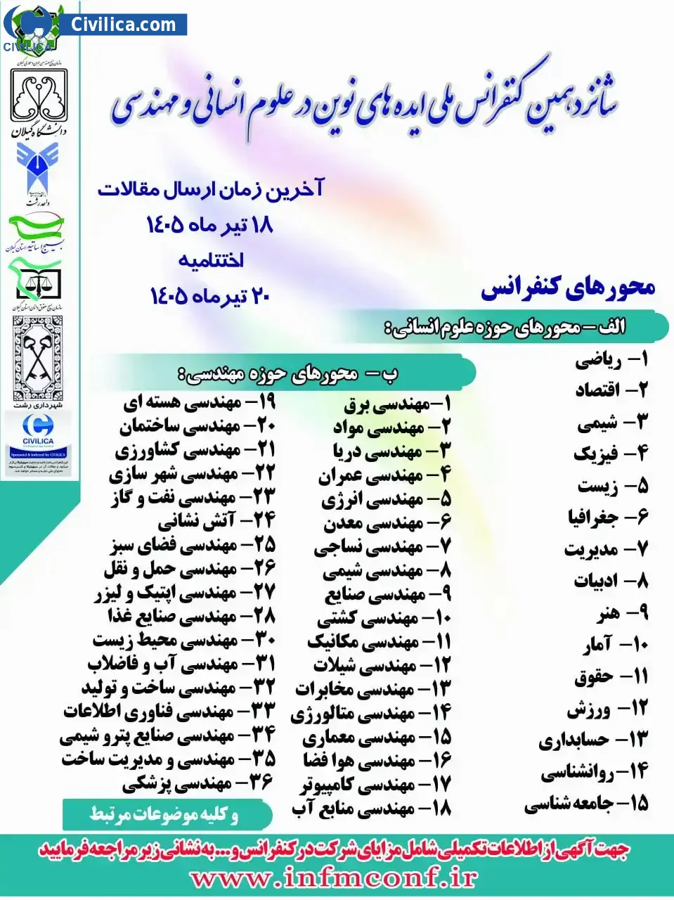 شانزدهمین کنفرانس ملی ایده های نوین در علوم انسانی و مهندسی در تاریخ ۲۰ تیر ۱۴۰۵ توسط ،سازمان بسیج مهندسین عمران و معماری گیلان در شهر رشت برگزار خواهد شد.با توجه به اینکه این همایش به صورت رسمی برگزار می گردد، کلیه مقالات این کنفرانس در پایگاه سیویلیکا و نیز کنسرسیوم محتوای ملی نمایه خواهد شد و شما می توانید با اطمینان کامل، مقالات خود را در این همایش ارائه نموده و از امتیازات علمی ارائه مقاله کنفرانس با دریافت گواهی کنفرانس استفاده نمایید.