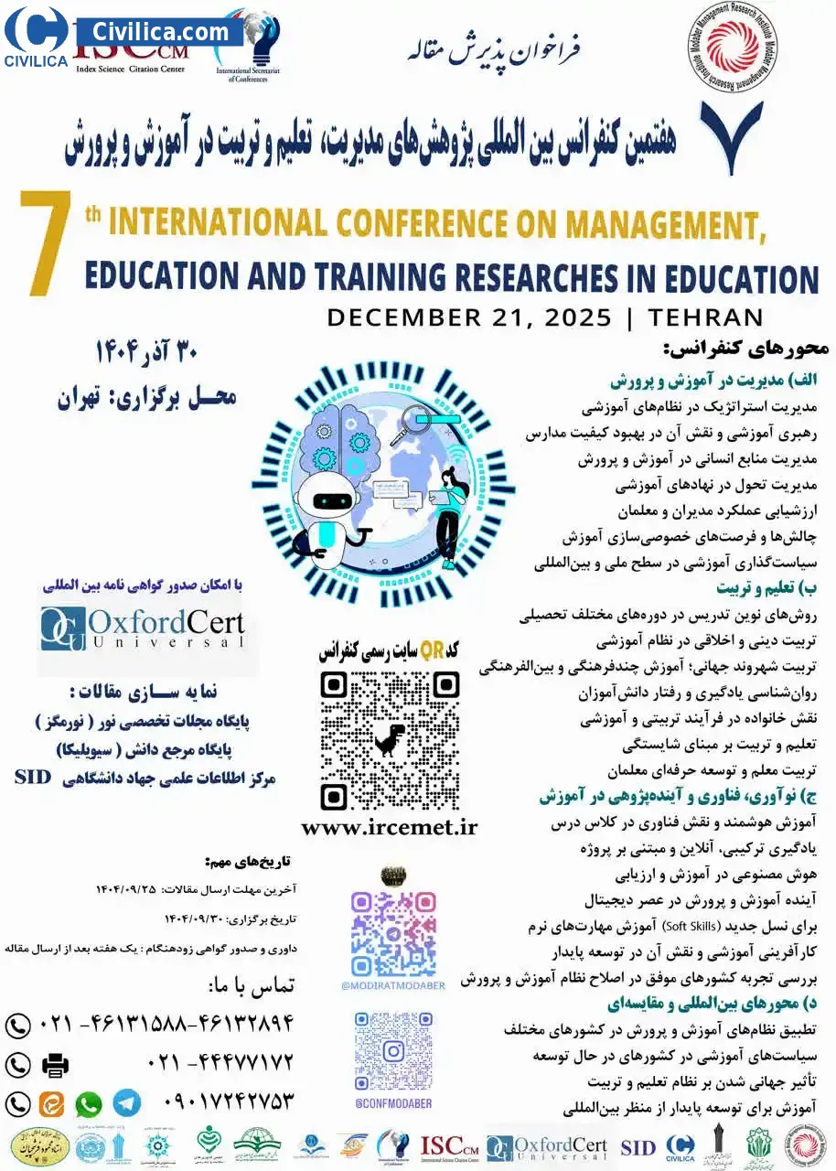 هفتمین کنفرانس بین المللی پژوهش های مدیریت، تعلیم و تربیت در آموزش و پرورش در تاریخ ۲۵ اسفند ۱۴۰۴ توسط ،موسسه پژوهشی مدیریت مدبر و با مشارکت دانشگاه جامع علمی کاربردی خانه کارگر اسلامشهر و سایر مجامع علمی در شهر تهران برگزار خواهد شد.با توجه به اینکه این همایش به صورت رسمی برگزار می گردد، کلیه مقالات این کنفرانس در پایگاه سیویلیکا و نیز کنسرسیوم محتوای ملی نمایه خواهد شد و شما می توانید با اطمینان کامل، مقالات خود را در این همایش ارائه نموده و از امتیازات علمی ارائه مقاله کنفرانس با دریافت گواهی کنفرانس استفاده نمایید.