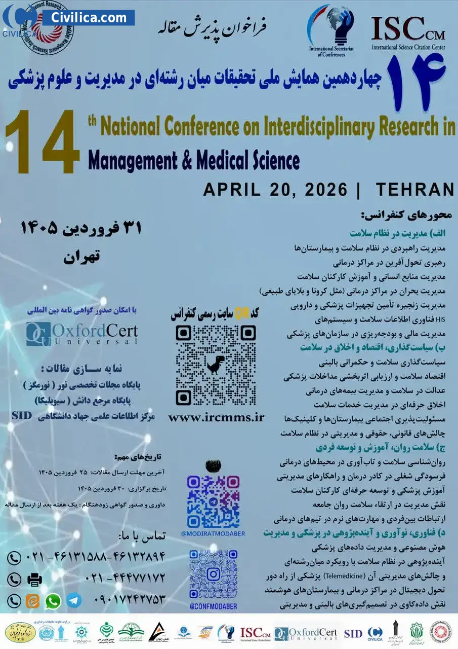 چهاردهمین همایش ملی تحقیقات میان رشته ای در مدیریت و علوم پزشکی در تاریخ ۳۱ فروردین ۱۴۰۵ توسط ،موسسه پژوهشی مدیریت مدبر با مشارکت دانشگاه و مجامع علمی در شهر تهران برگزار خواهد شد.با توجه به اینکه این همایش به صورت رسمی برگزار می گردد، کلیه مقالات این کنفرانس در پایگاه سیویلیکا و نیز کنسرسیوم محتوای ملی نمایه خواهد شد و شما می توانید با اطمینان کامل، مقالات خود را در این همایش ارائه نموده و از امتیازات علمی ارائه مقاله کنفرانس با دریافت گواهی کنفرانس استفاده نمایید.