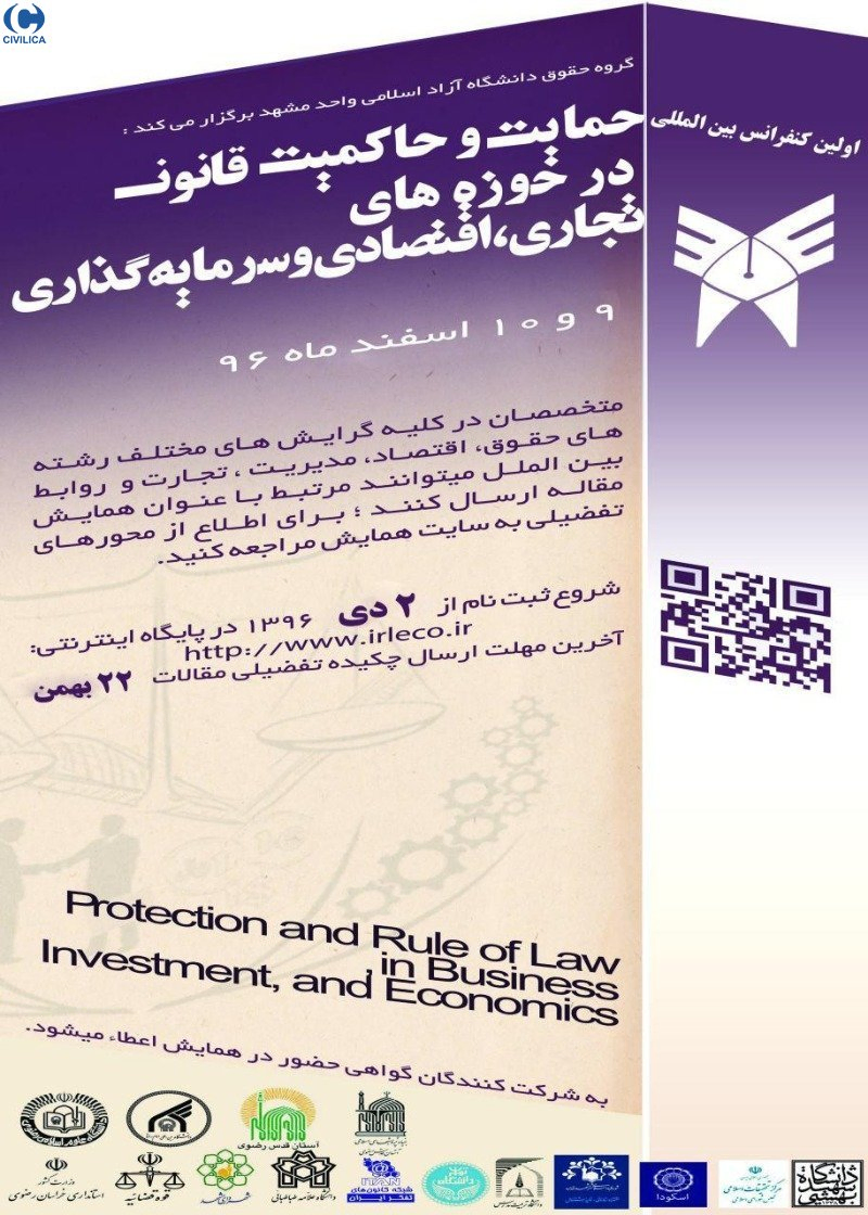 اولین کنفرانس بین المللی حمایت و حاکمیت قانون در حوزه های تجاری،اقتصادی و سرمایه گذاری در تاریخ ۹ اسفند ۱۳۹۶ توسط دانشگاه آزاد اسلامی واحد مشهد،دانشگاه آزاد اسلامي مشهد در شهر مشهد برگزار گردید.این همایش تحت حمایت سیویلیکا بوده است و به محض اتمام مراحل نمایه سازی، مقالات آن از طریق همین پایگاه منتشر خواهد شد.