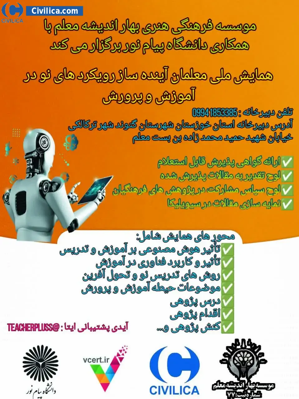 اولین همایش ملی معلمان آینده ساز؛ رویکردهای نو در آموزش و پرورش در تاریخ ۳۰ آبان ۱۴۰۴ توسط ،موسسه فرهنگی هنری بهار اندیشه معلم آموزش و پرورش شهرستان گتونددانشگاه پیام نور شهرستان گتوند در شهر گتوند برگزار خواهد شد.با توجه به اینکه این همایش به صورت رسمی برگزار می گردد، کلیه مقالات این کنفرانس در پایگاه سیویلیکا و نیز کنسرسیوم محتوای ملی نمایه خواهد شد و شما می توانید با اطمینان کامل، مقالات خود را در این همایش ارائه نموده و از امتیازات علمی ارائه مقاله کنفرانس با دریافت گواهی کنفرانس استفاده نمایید.
