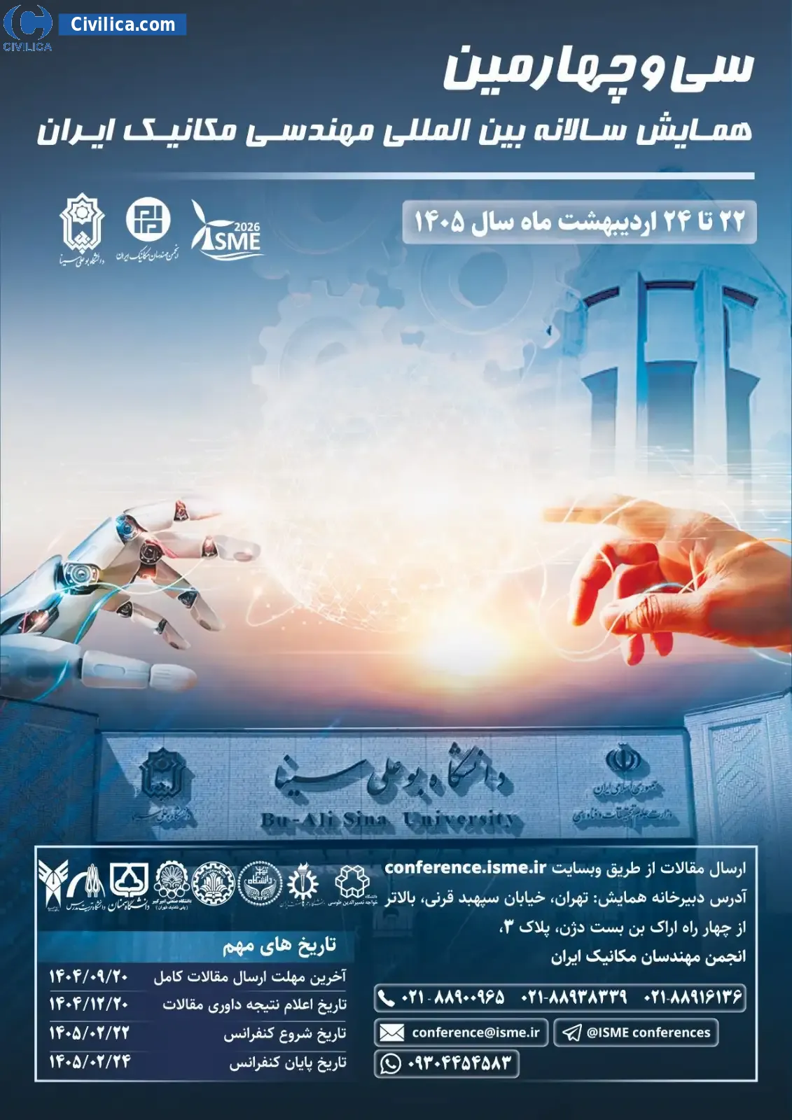 سی و چهارمین همایش سالانه بین المللی مهندسی مکانیک ایران در تاریخ ۲۲ اردیبهشت ۱۴۰۵ توسط ،انجمن مهندسان مکانیک ایران در شهر همدان برگزار خواهد شد.با توجه به اینکه این همایش به صورت رسمی برگزار می گردد، کلیه مقالات این کنفرانس در پایگاه سیویلیکا و نیز کنسرسیوم محتوای ملی نمایه خواهد شد و شما می توانید با اطمینان کامل، مقالات خود را در این همایش ارائه نموده و از امتیازات علمی ارائه مقاله کنفرانس با دریافت گواهی کنفرانس استفاده نمایید.