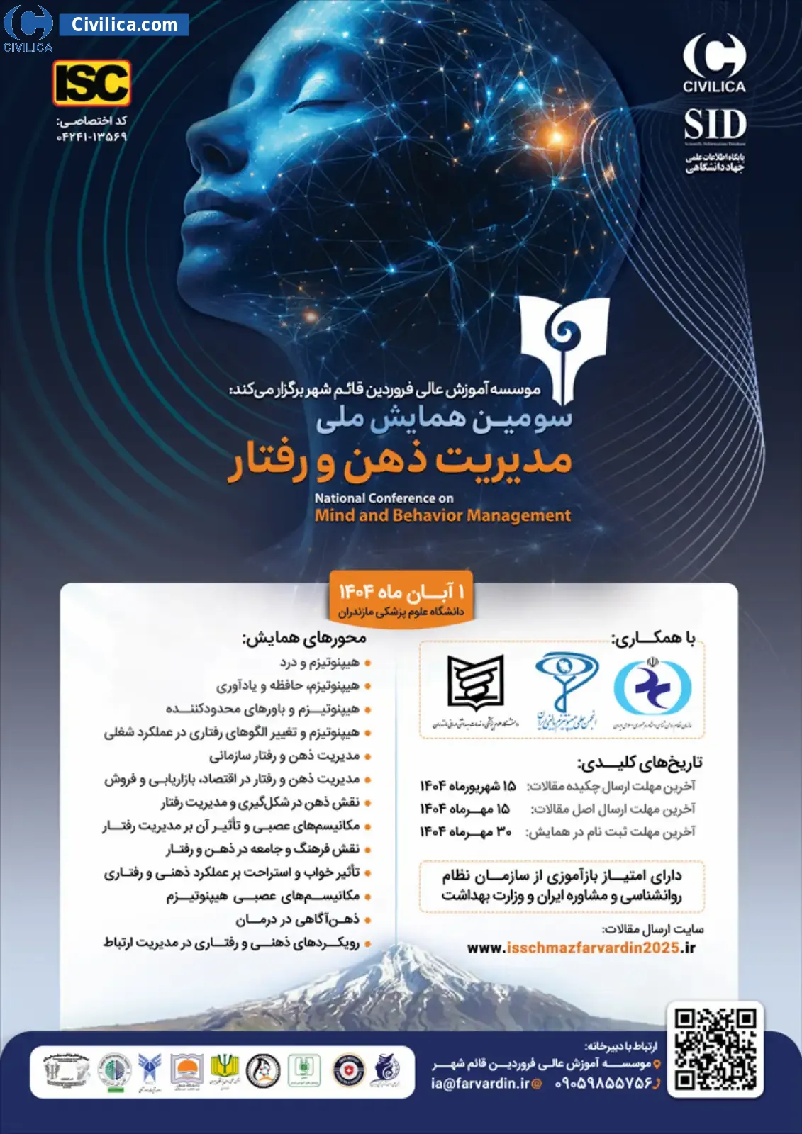 همایش ملی مدیریت ذهن و رفتار در تاریخ ۱ آبان ۱۴۰۴ توسط موسسه آموزش عالی فروردین،انجمن علمی هیپنوتیزم بالینی ایران در شهر ساری برگزار گردید.این همایش تحت حمایت سیویلیکا بوده است و به محض اتمام مراحل نمایه سازی، مقالات آن از طریق همین پایگاه منتشر خواهد شد.